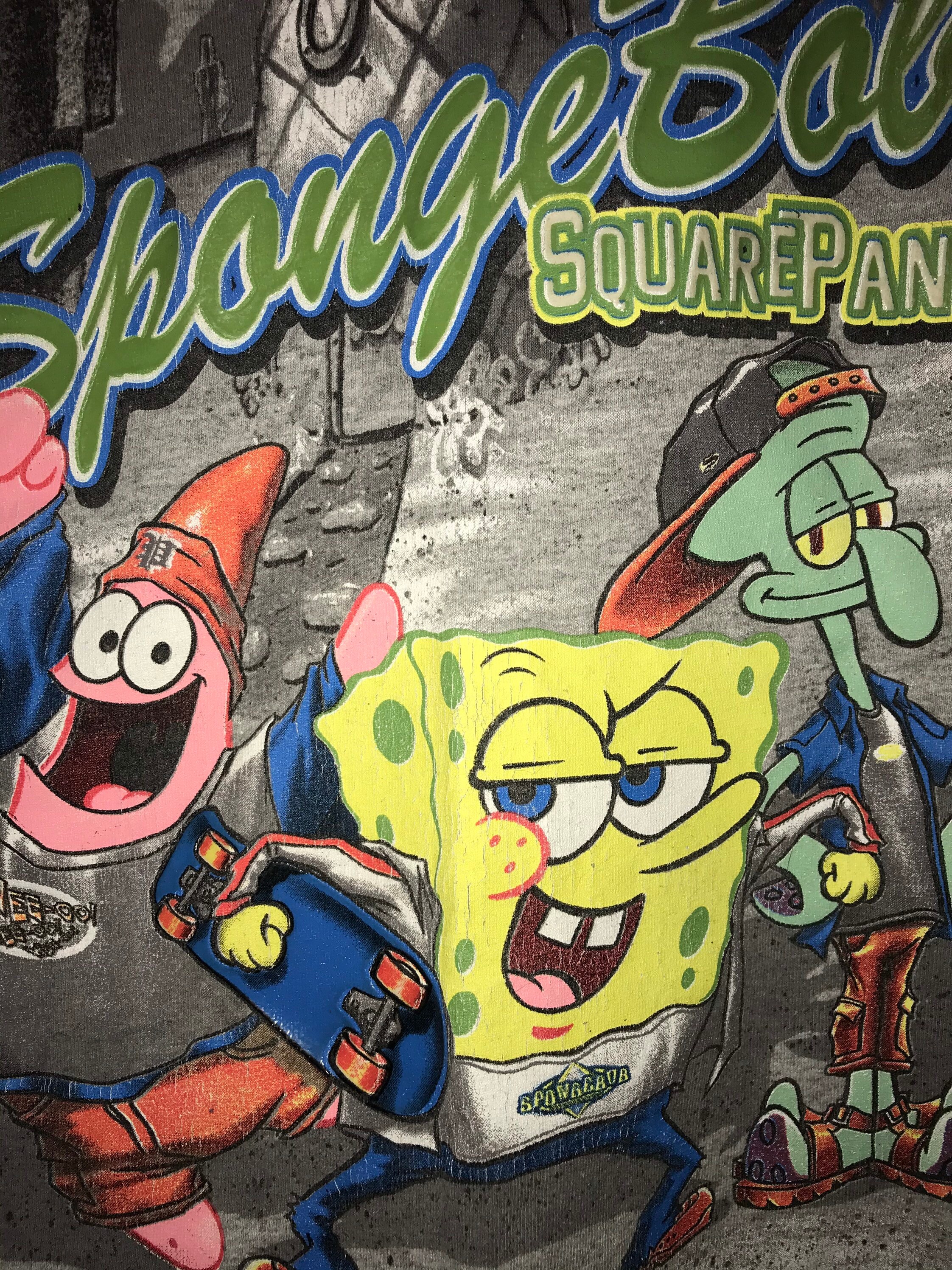 This is a cute kids Sponge Bob Squarepants tshirt. It’s in good vintage condition, with some wear and tear on the vinyl.