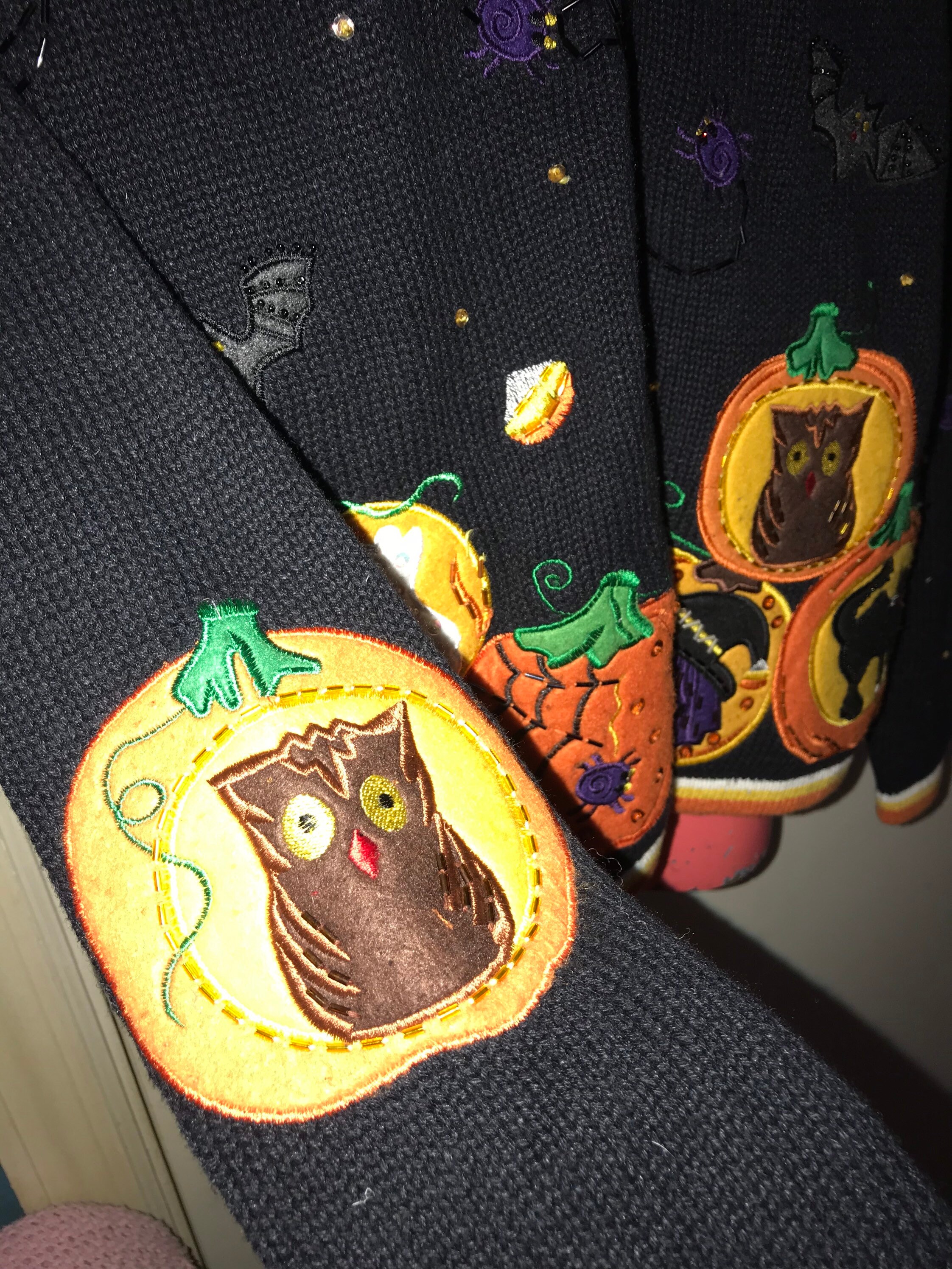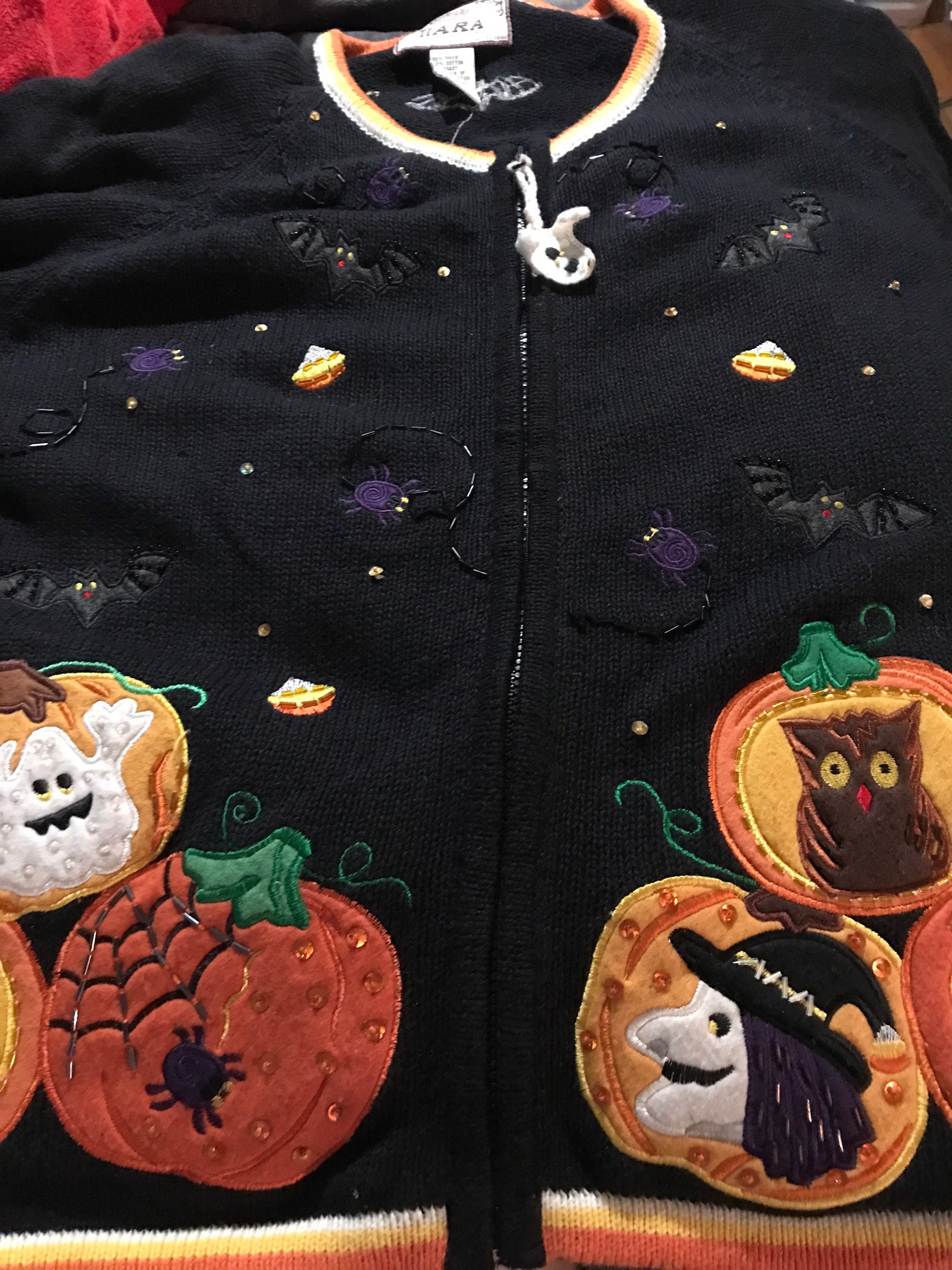 Very very cute little "ugly" Halloween sweater. Its got loads of different stuff on it. It zips up so it can be worn open or closed. It’s in good vintage condition! It's very cute.