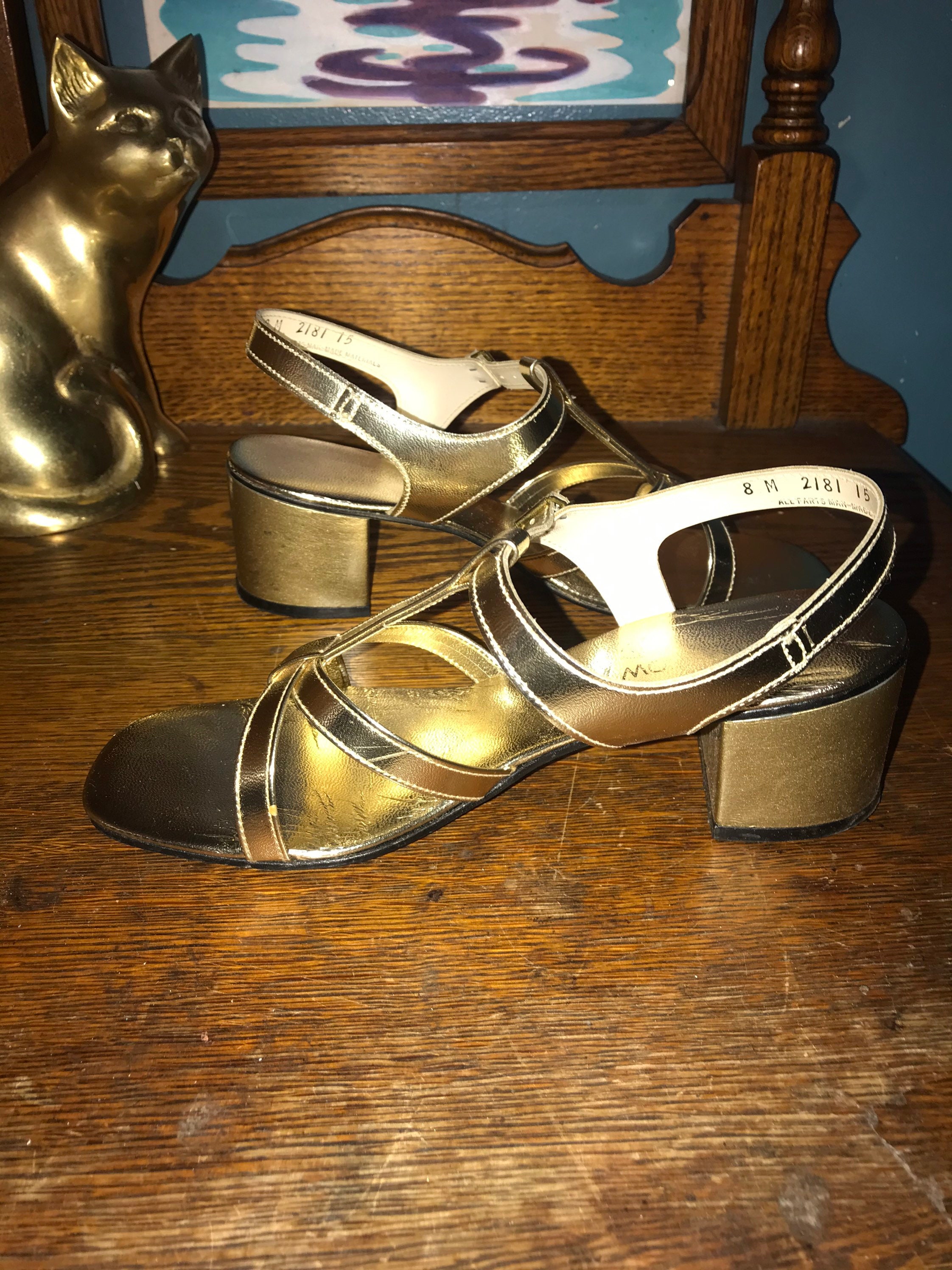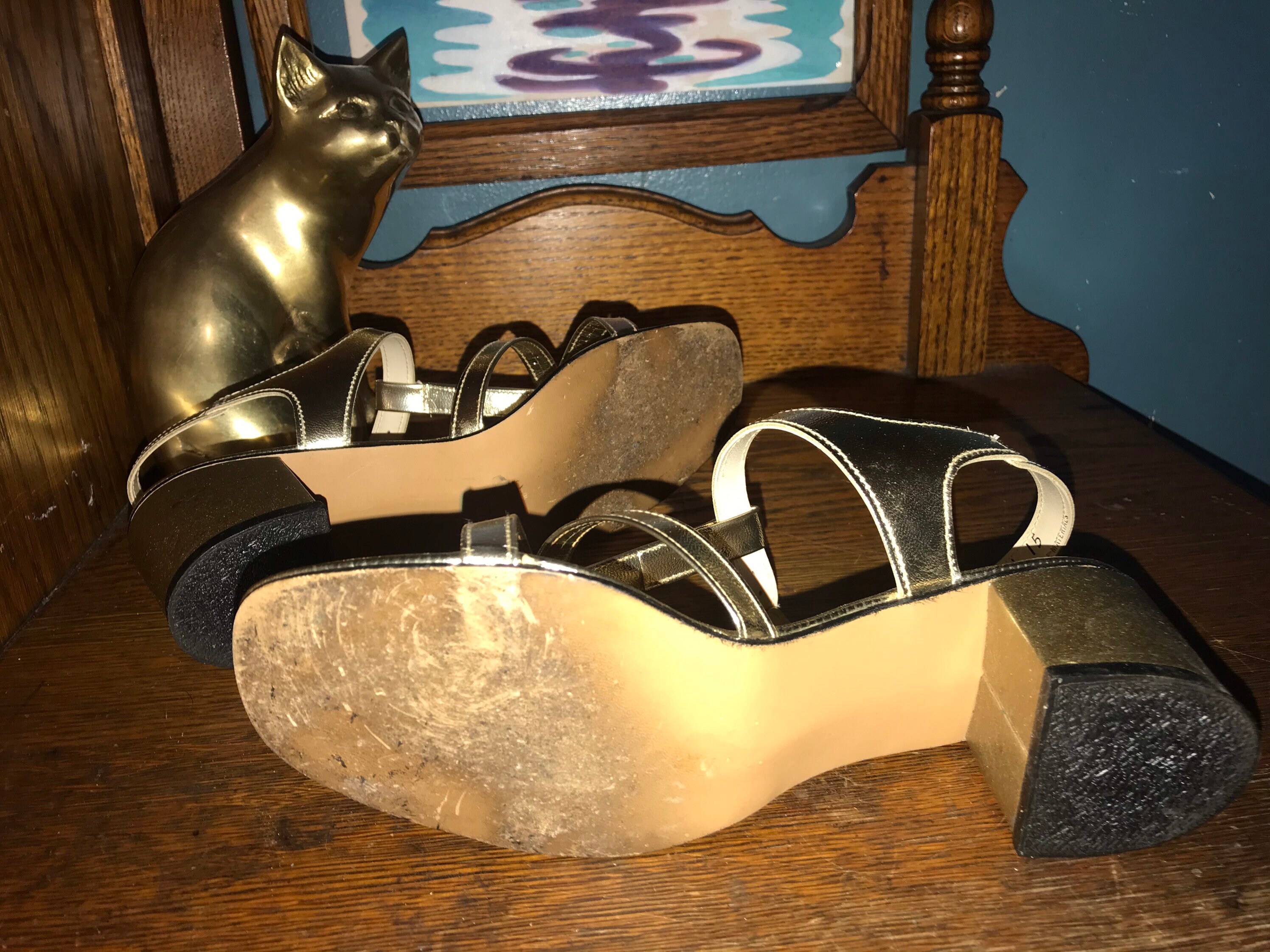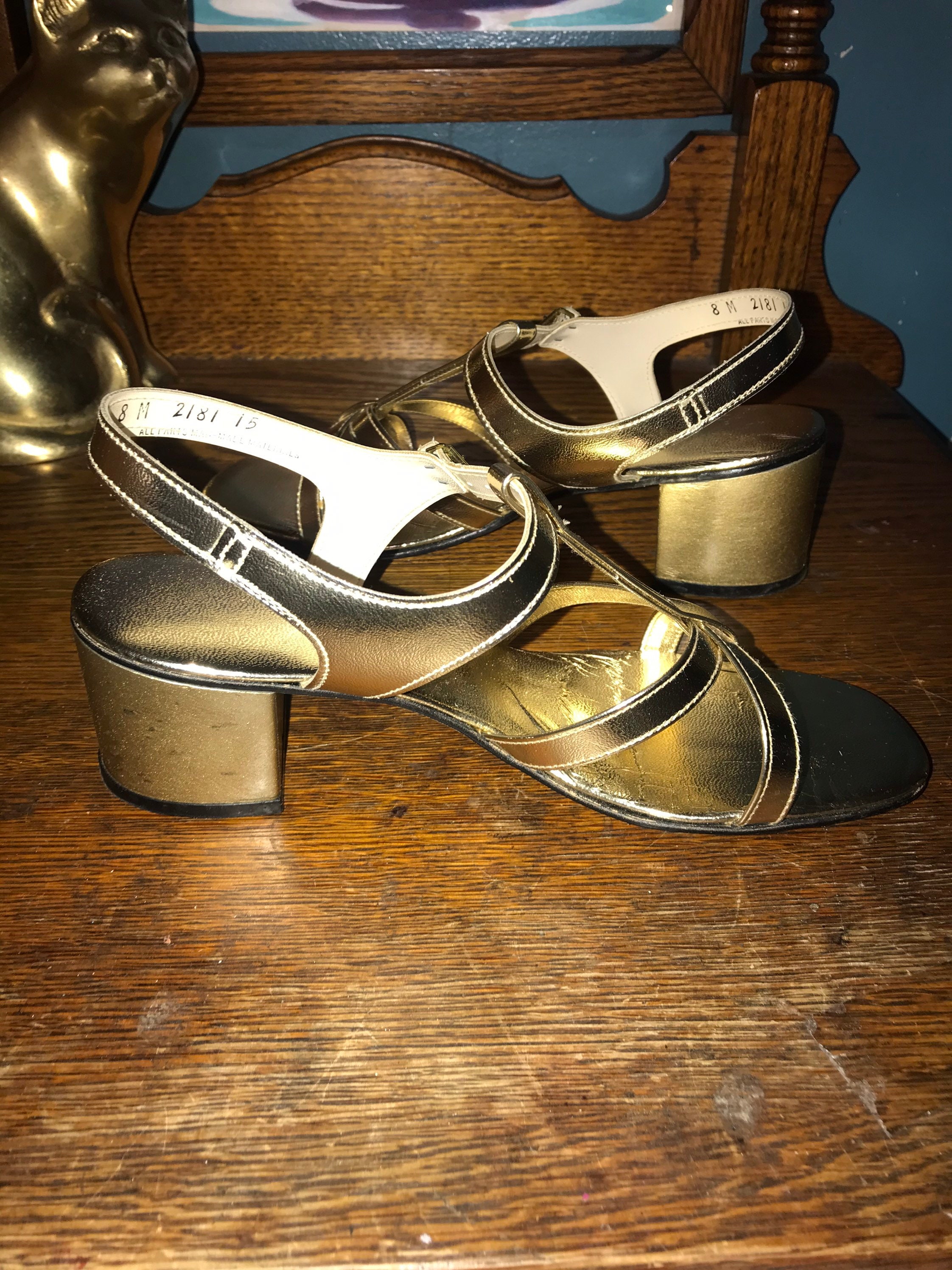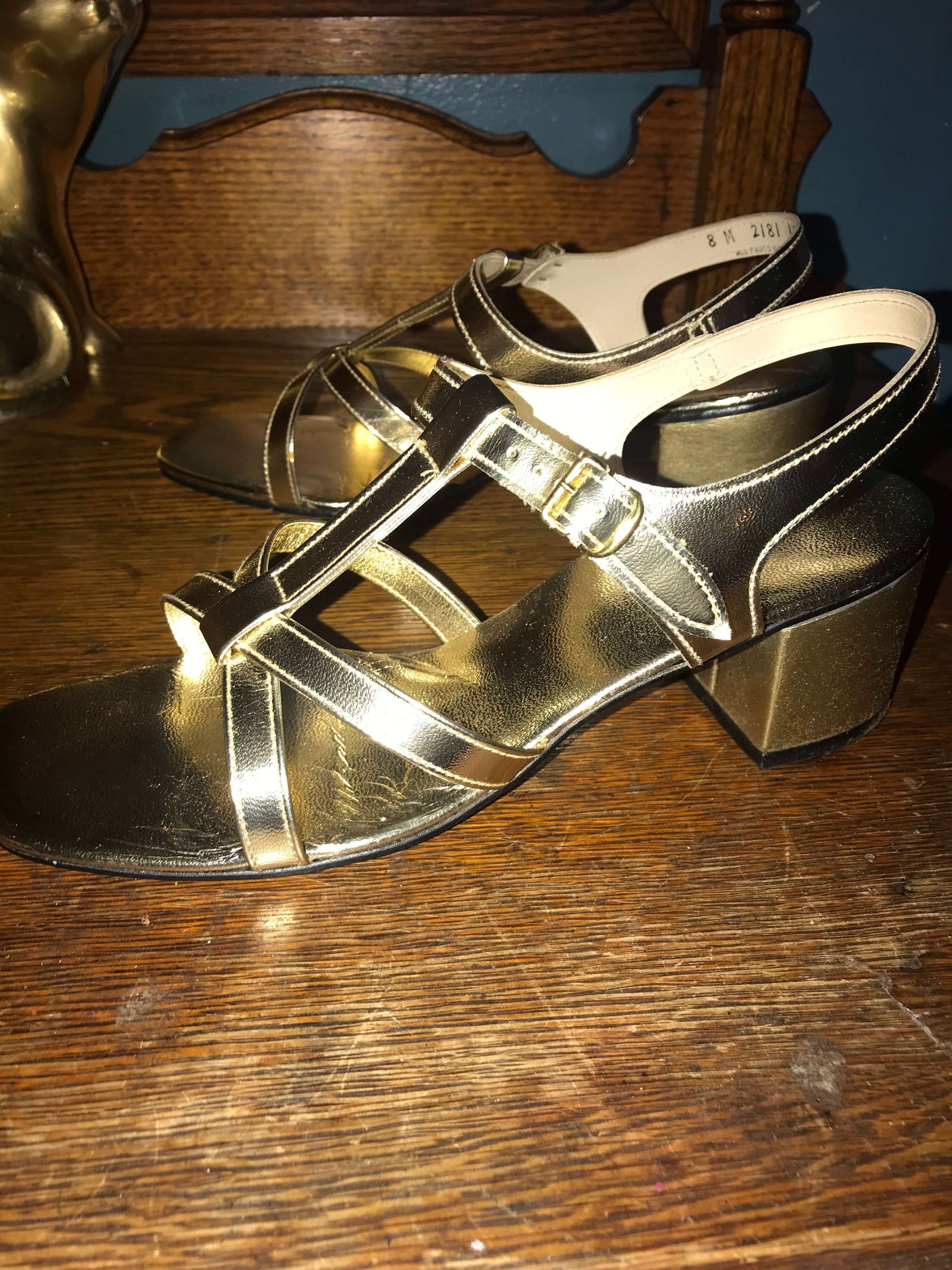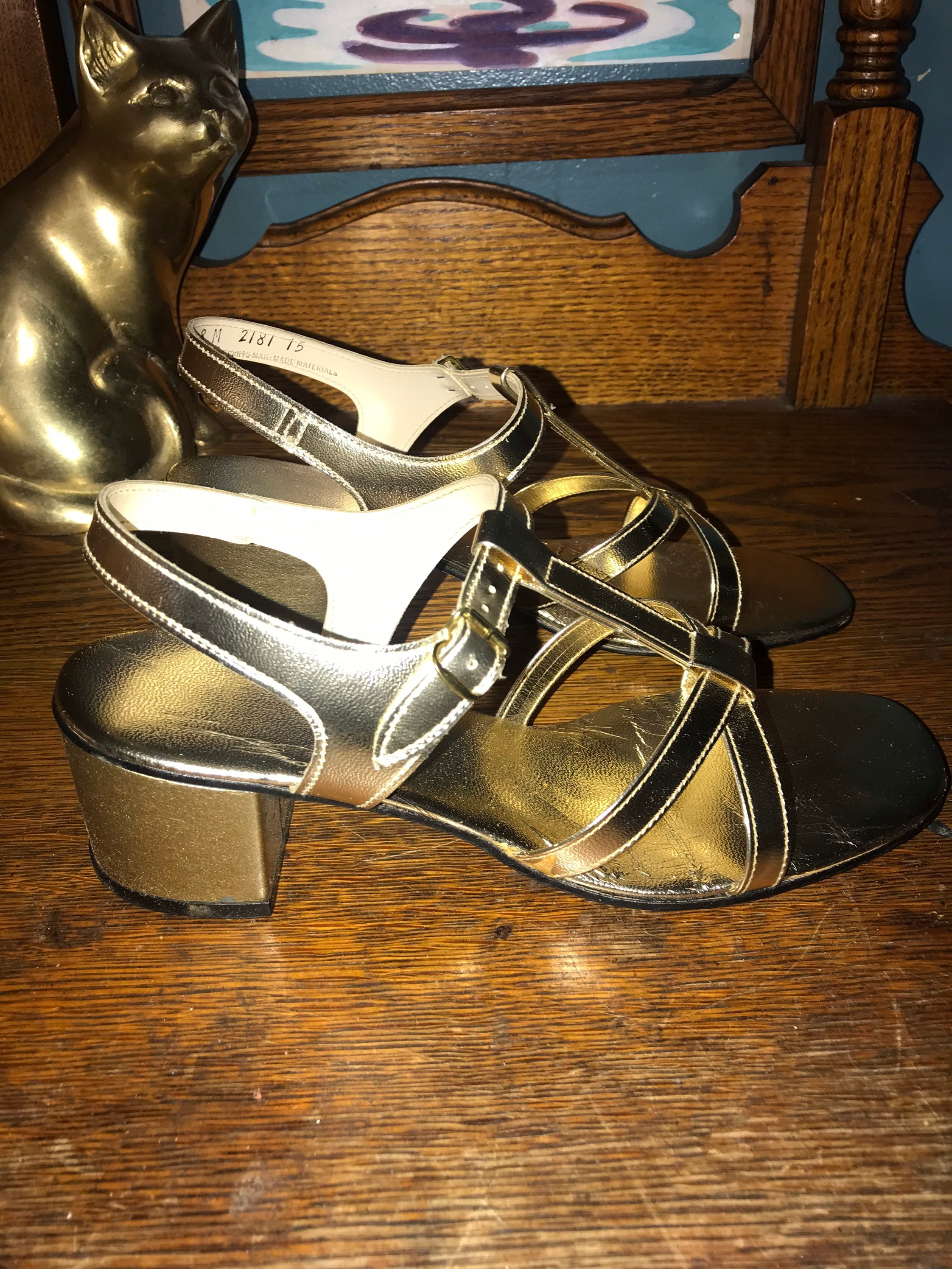 This is a too cute pair of metallic gold high heel strappy sandals! They are perfect dancing shoes. They are in really good condition for their age, minimal wear and tear issues, (see photos).