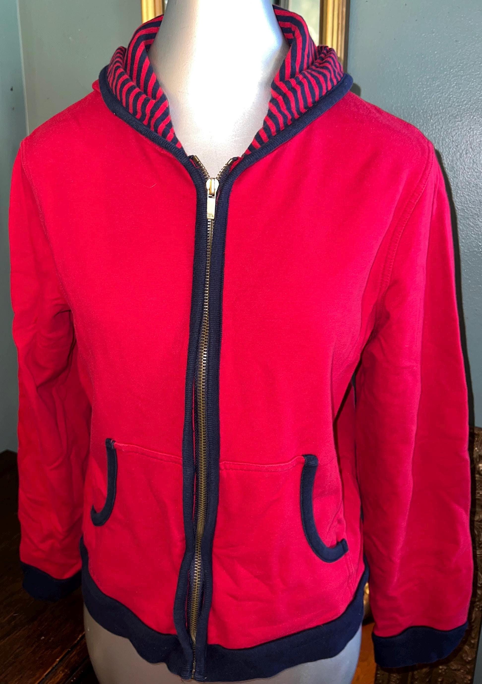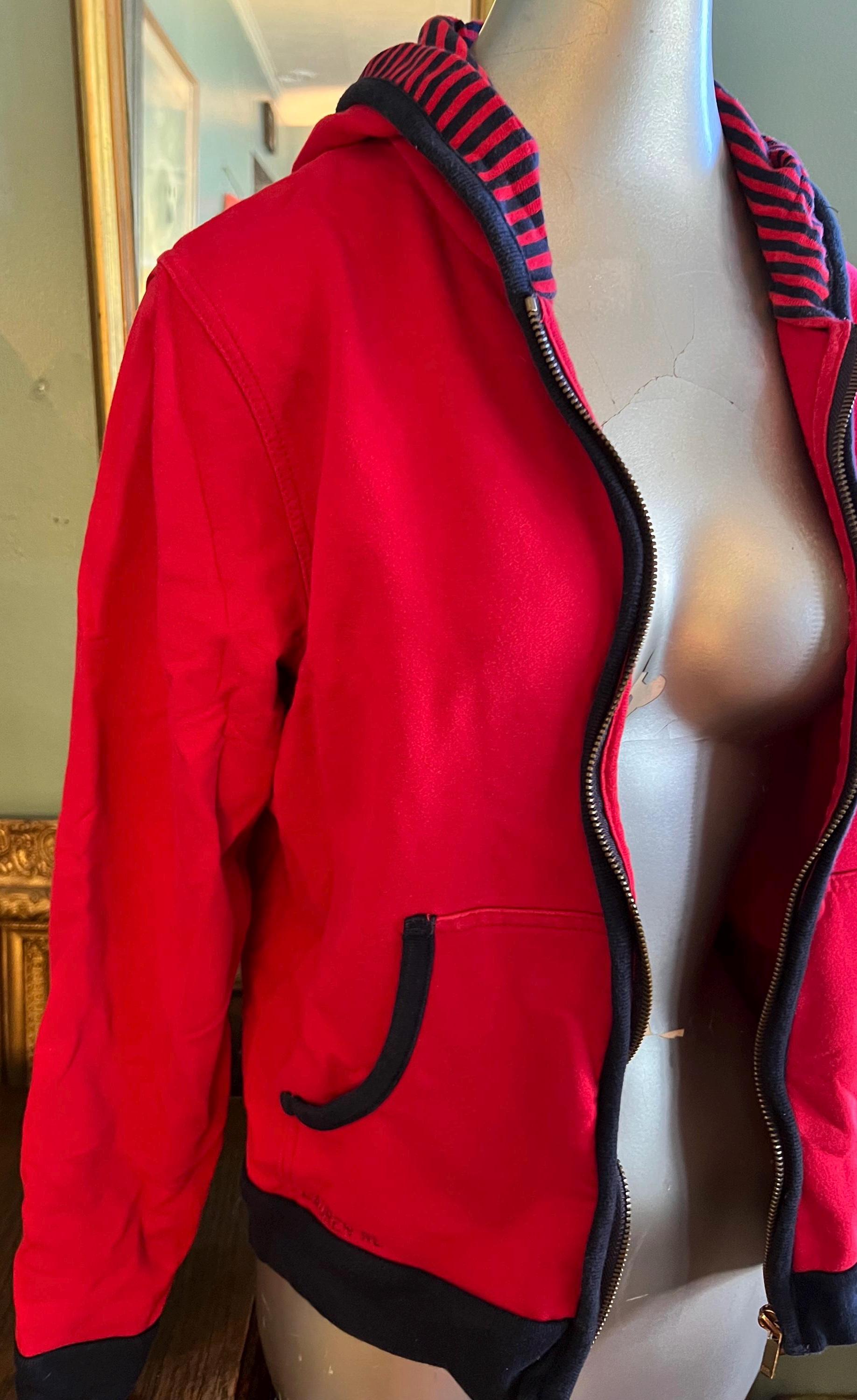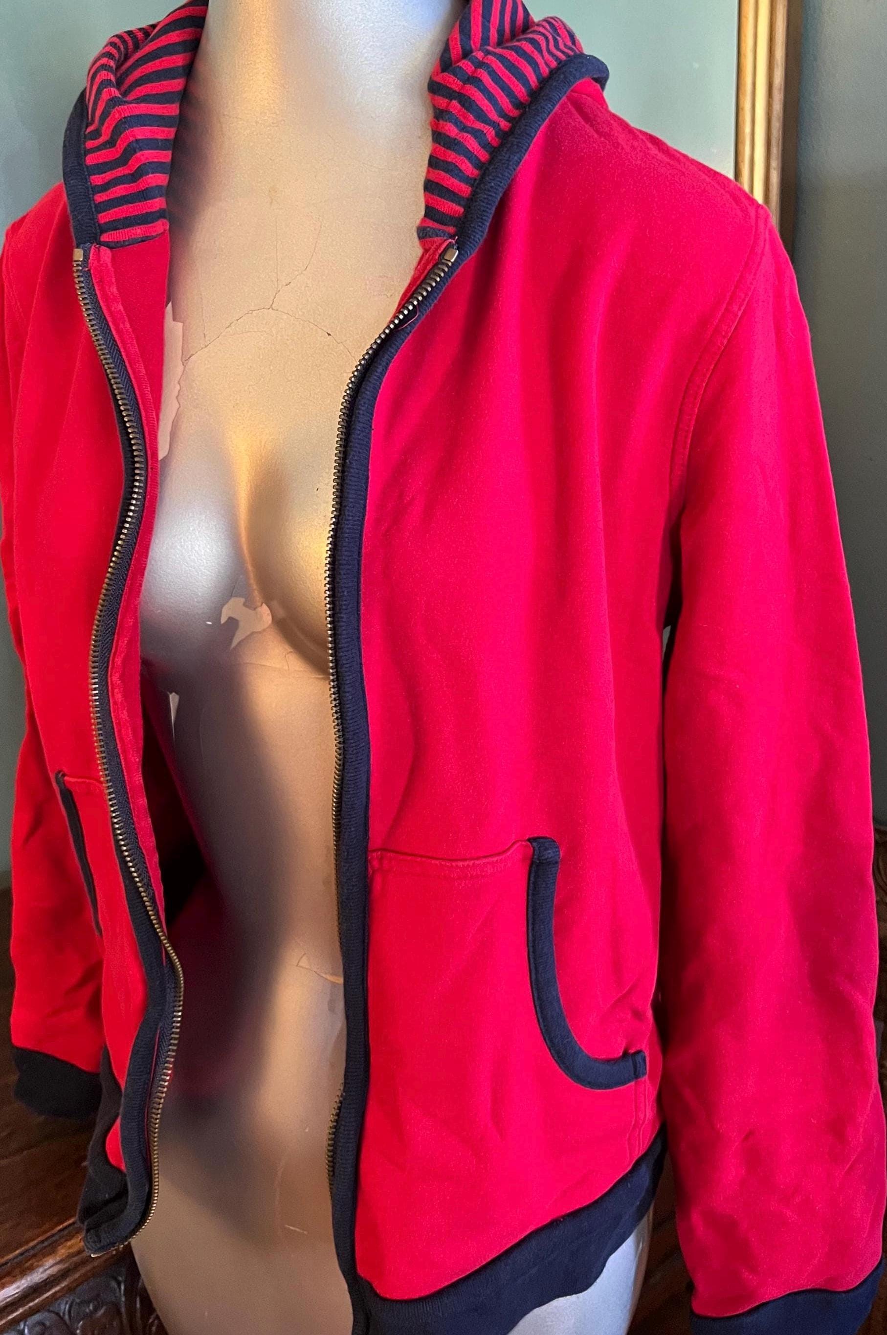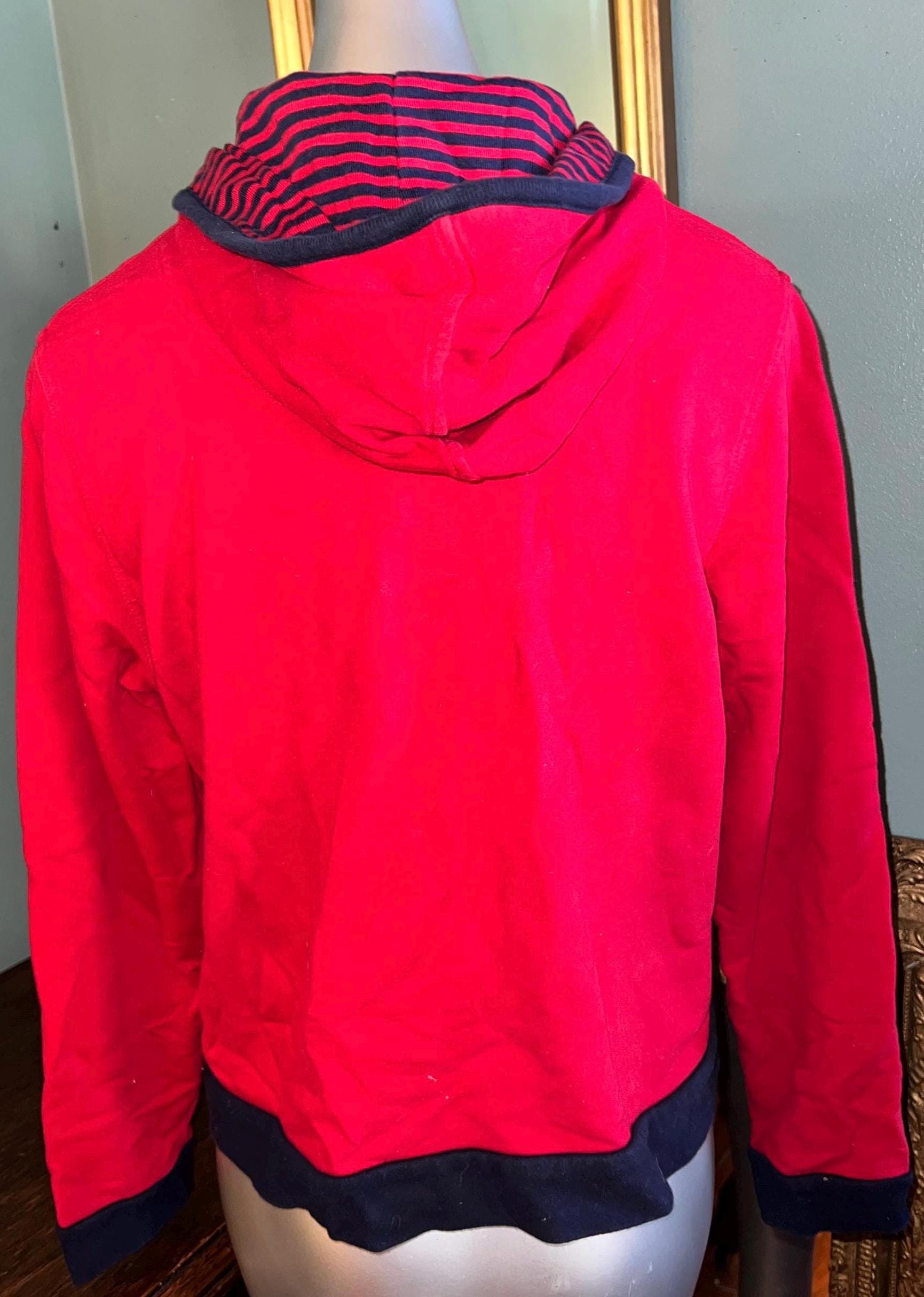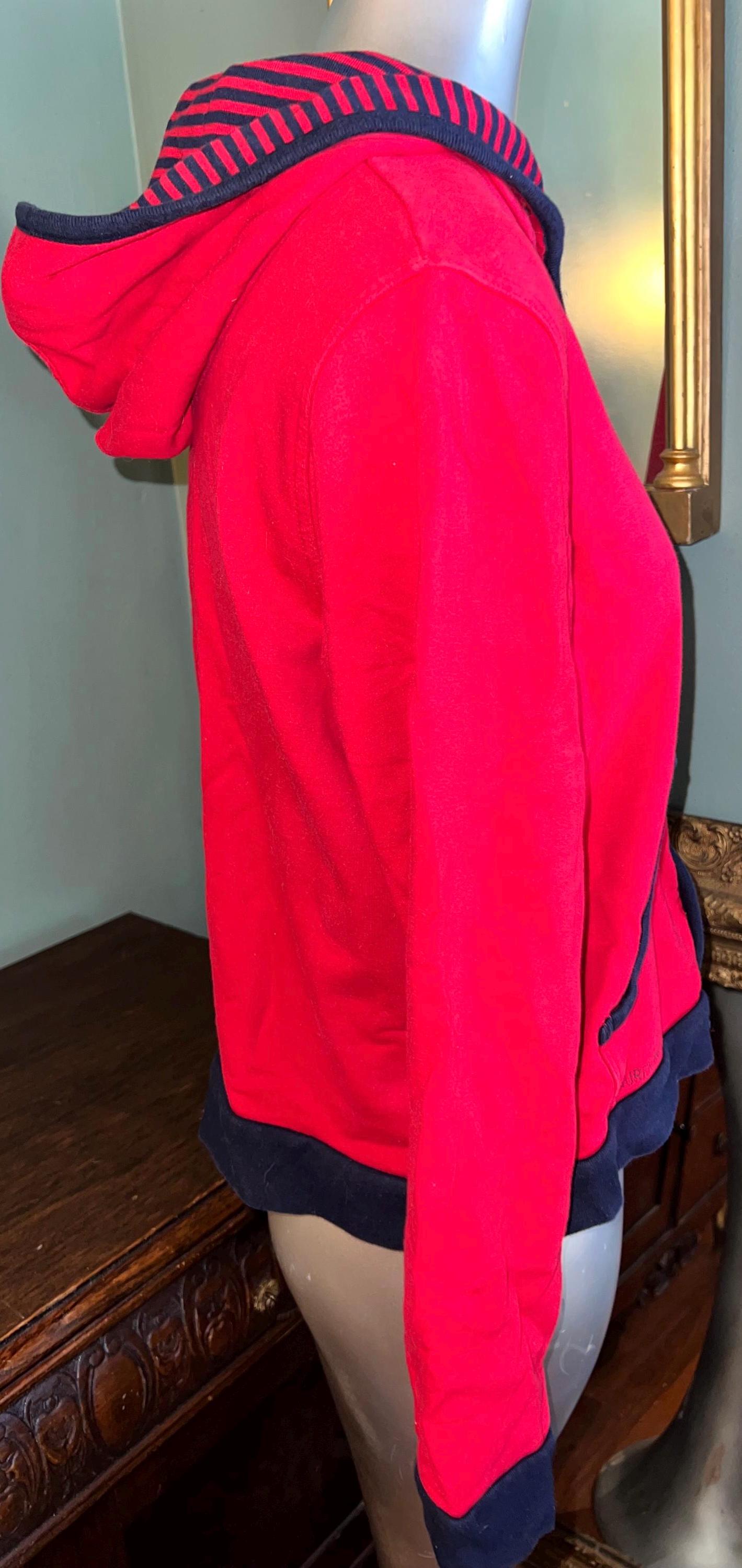 This is a nice little stretchy red and navy zip up hooded sweatshirt. It’s all red and trimmed in baby blue It has blue stripes on the inner side of the hood. There is a gold metal zipper pull. It’s very nice and in and in good vintage condition.