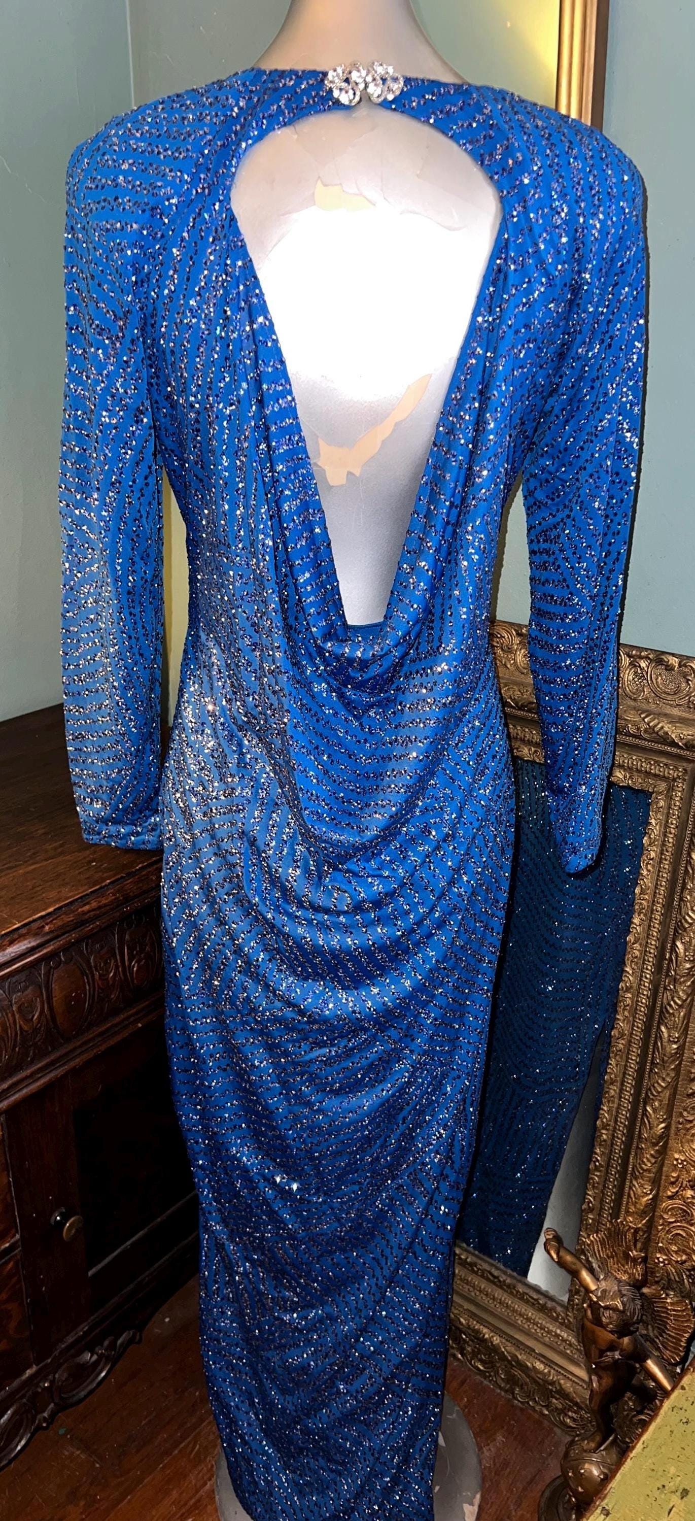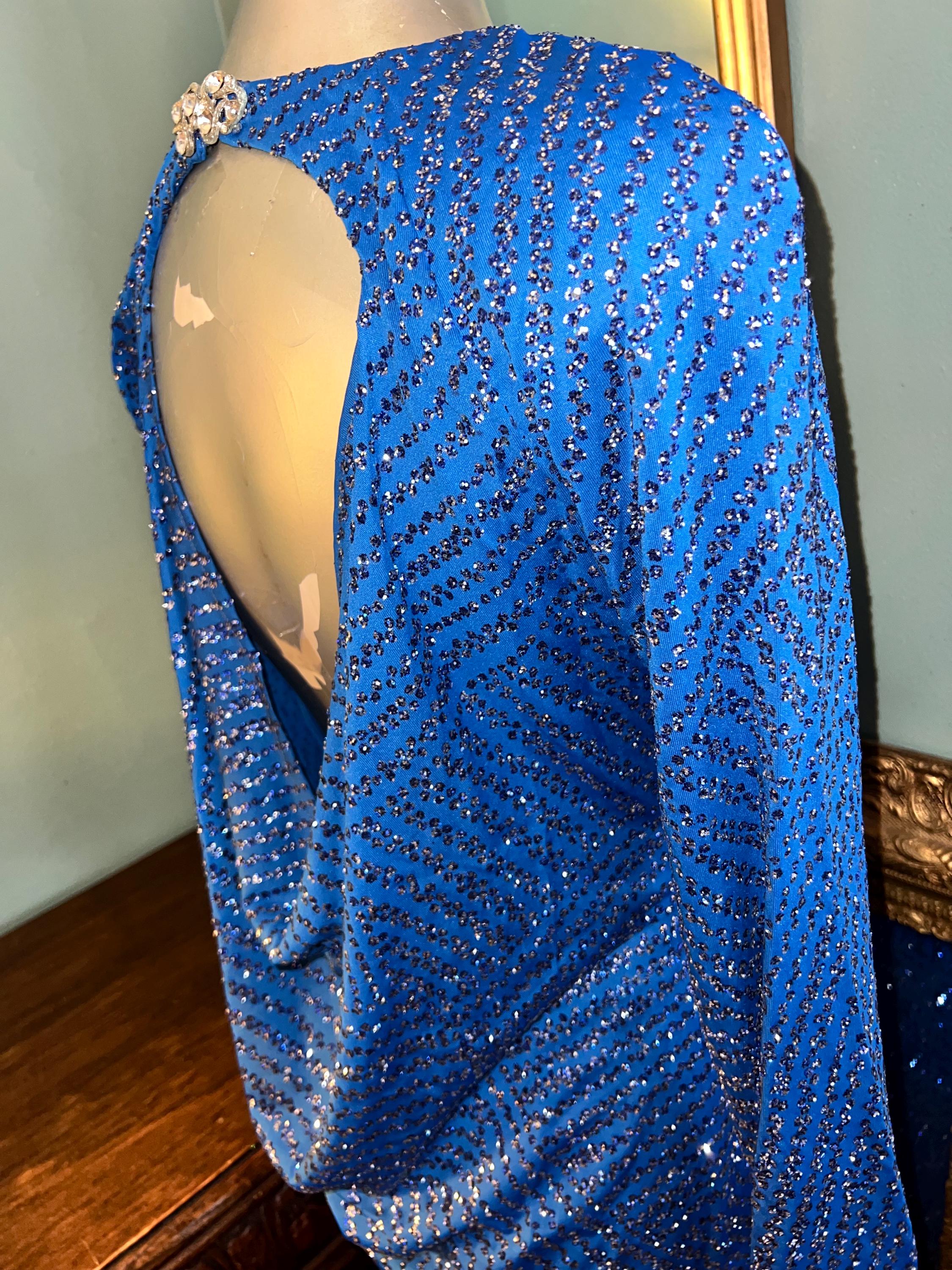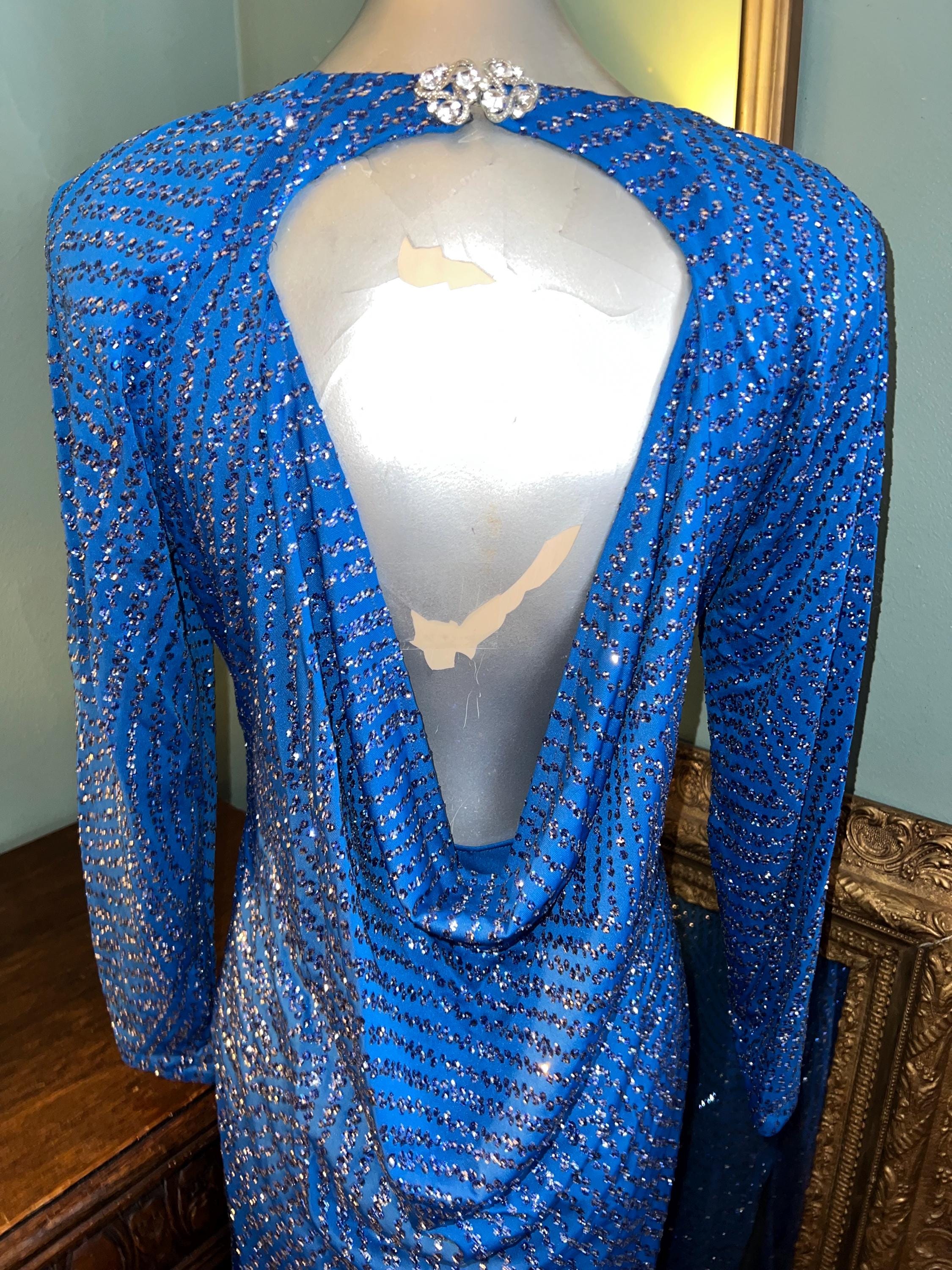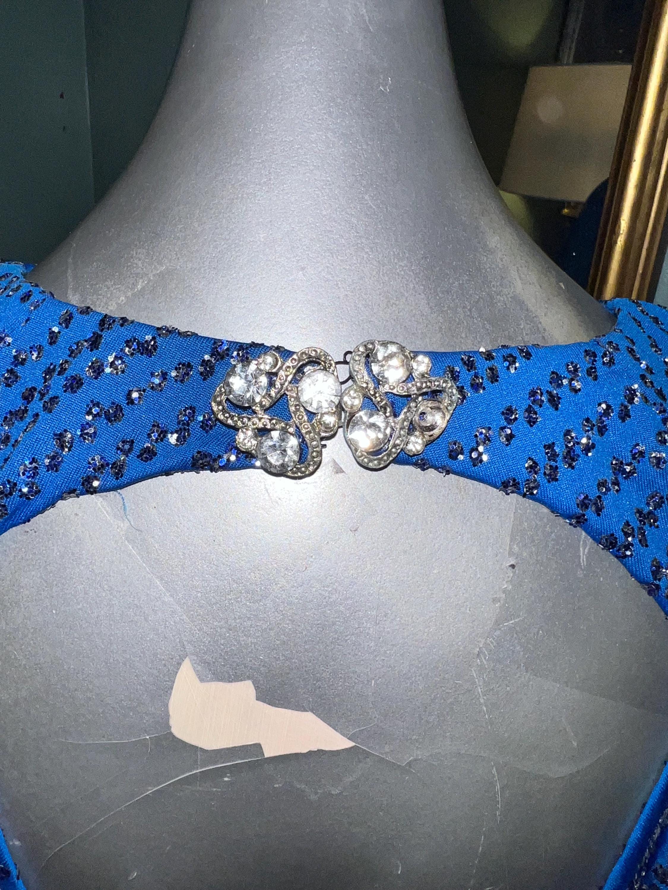 This is a beautiful royal blue open back glitterized ankle length dress. The swooped down open back really makes this dress. It also has a beautiful rhinestone clasp on the back but it is missing one stone, (see photo). Otherwise the dress is in good vintage condition.