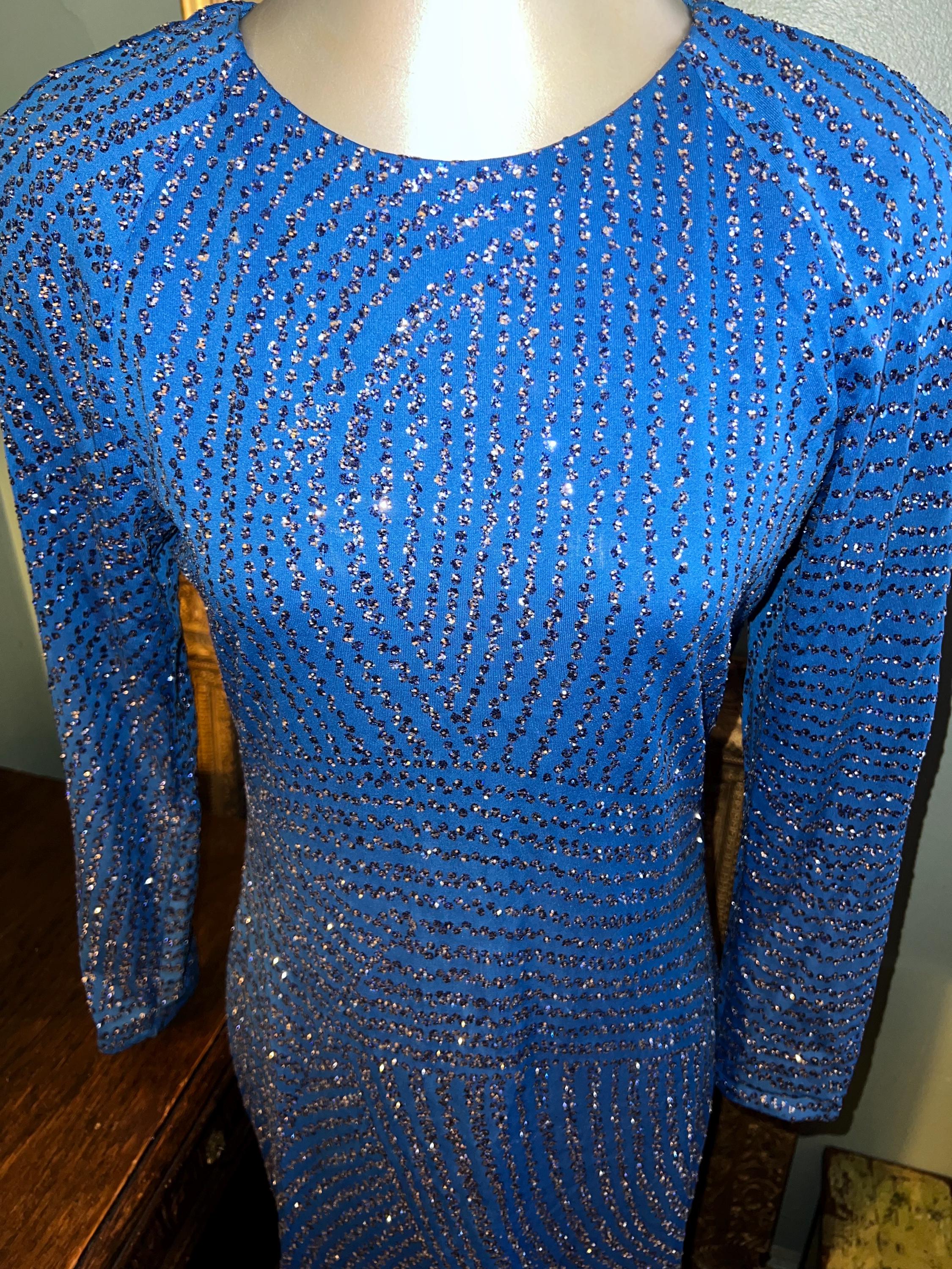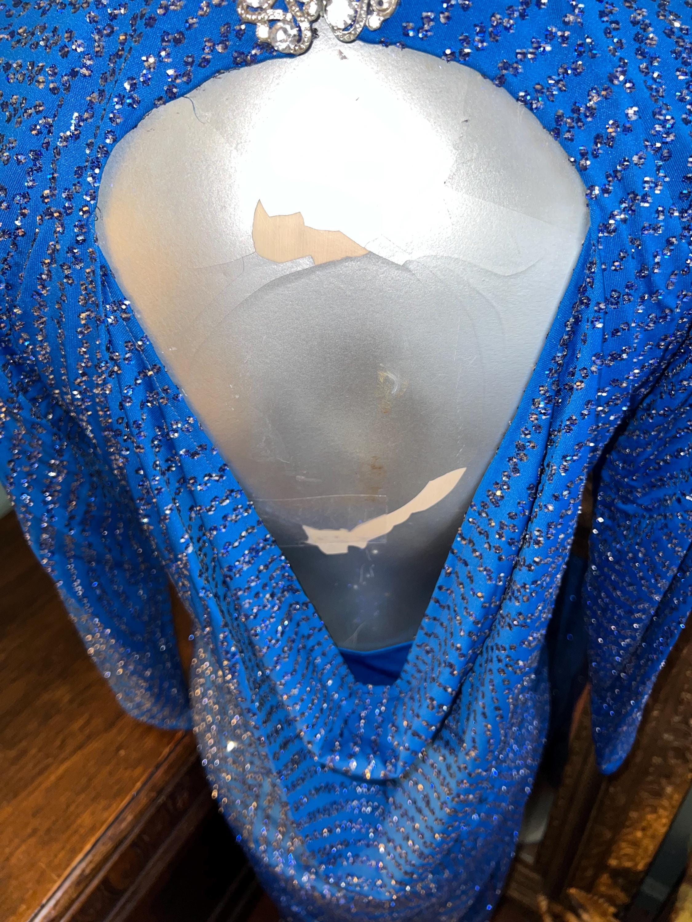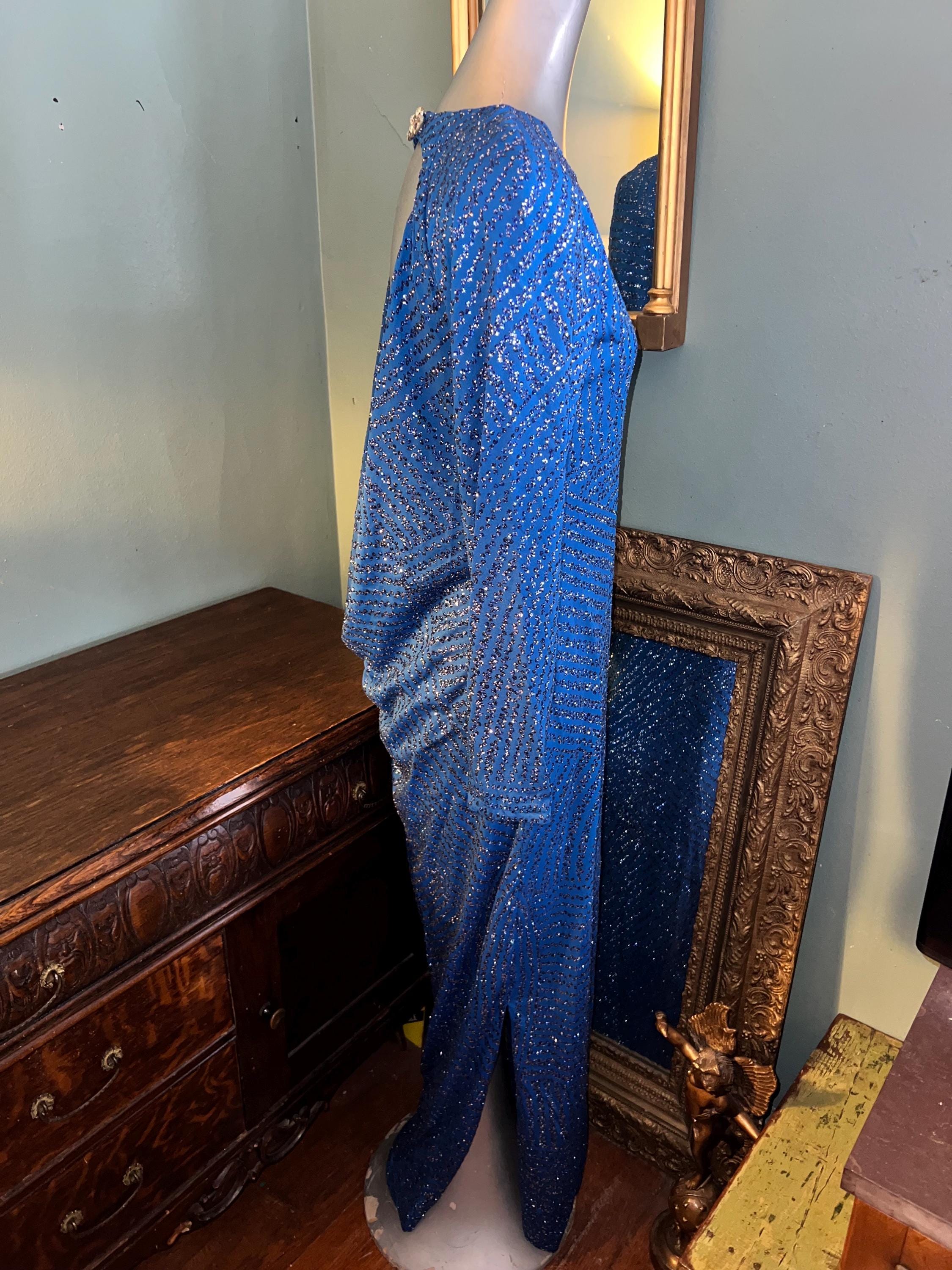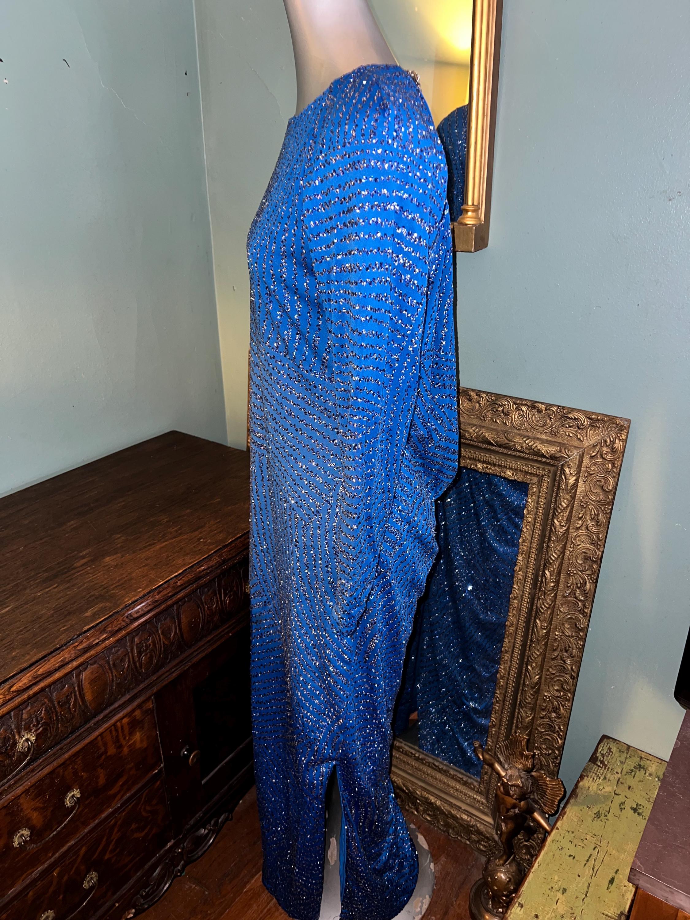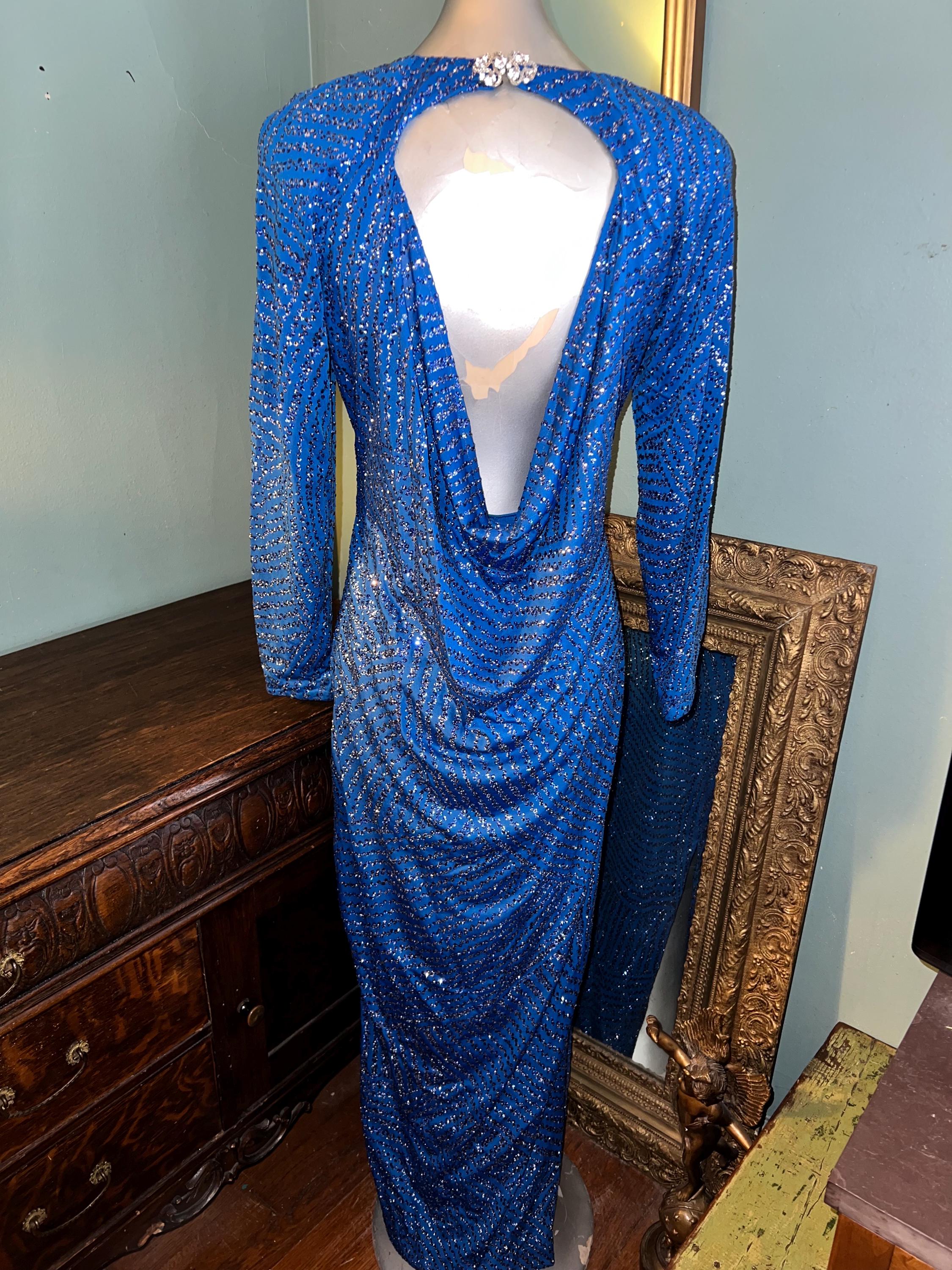 This is a beautiful royal blue open back glitterized ankle length dress. The swooped down open back really makes this dress. It also has a beautiful rhinestone clasp on the back but it is missing one stone, (see photo). Otherwise the dress is in good vintage condition.