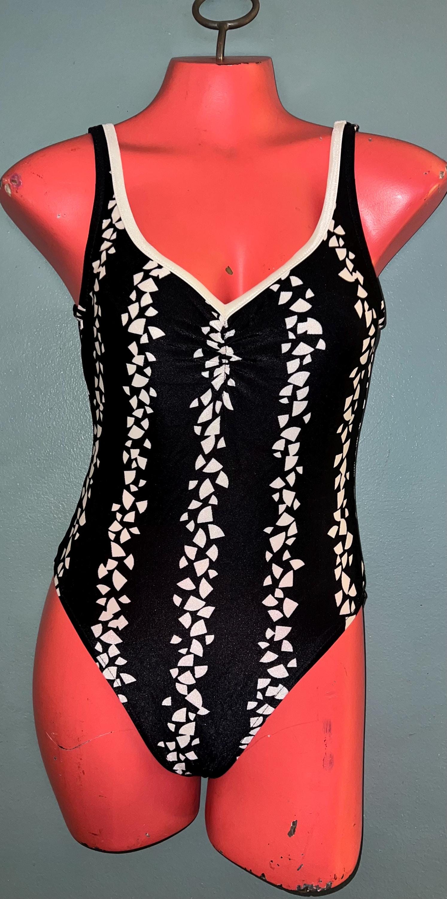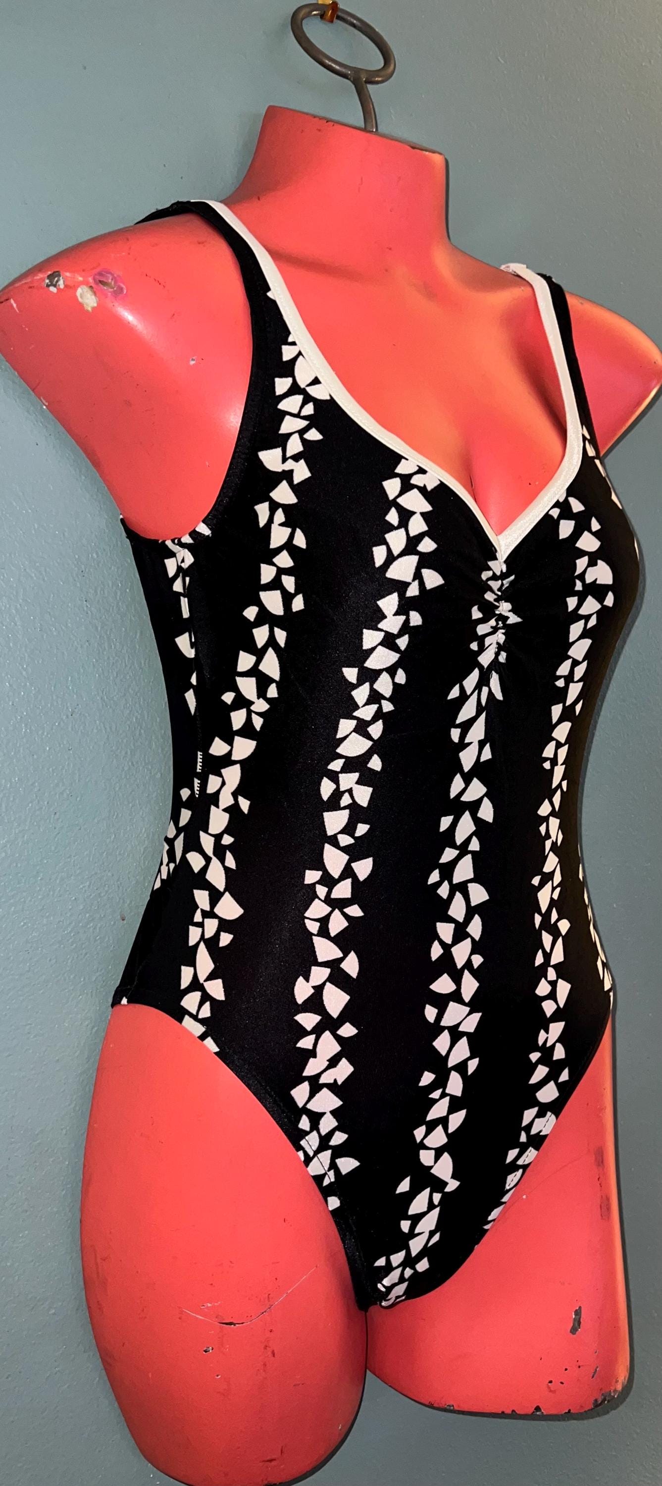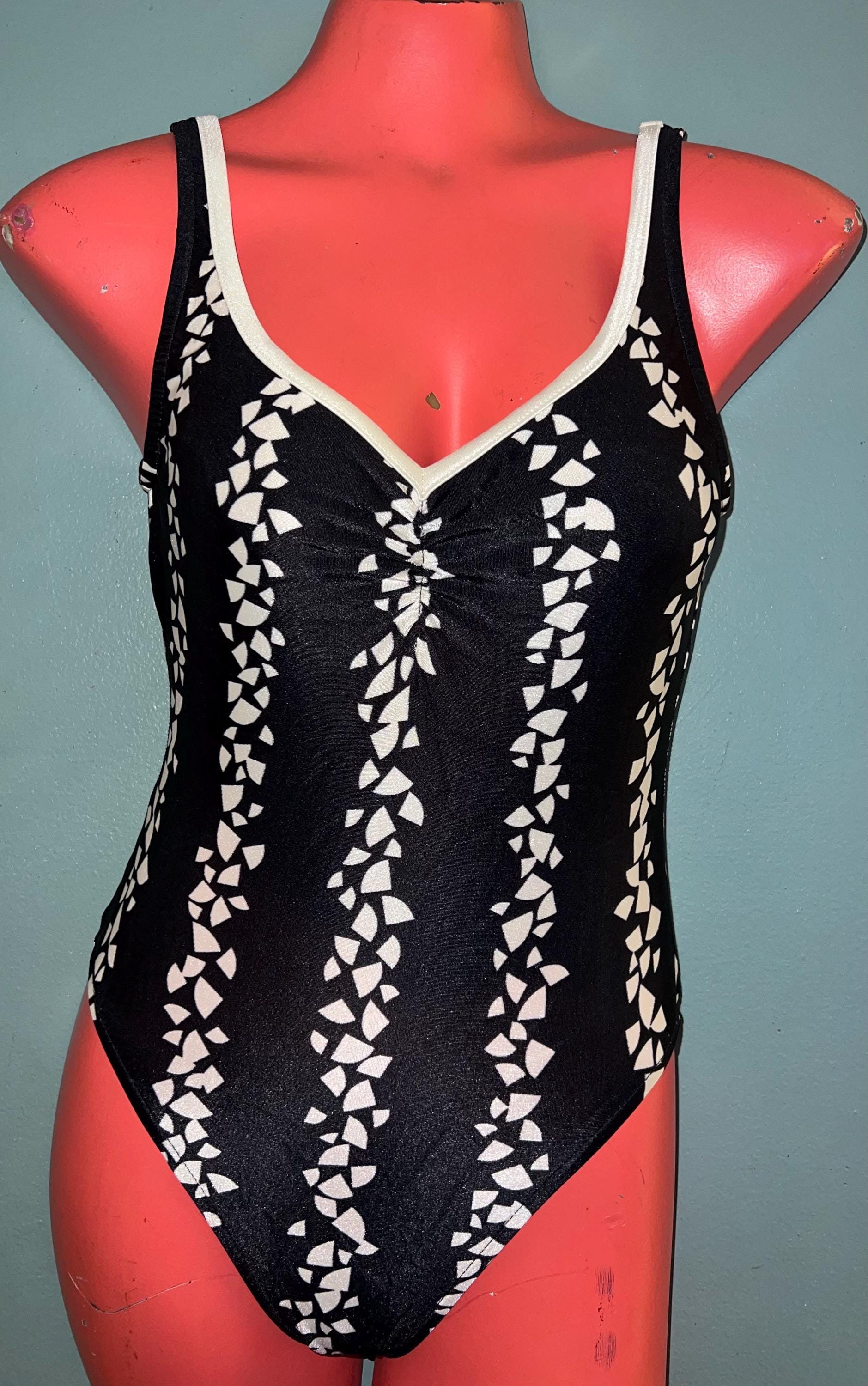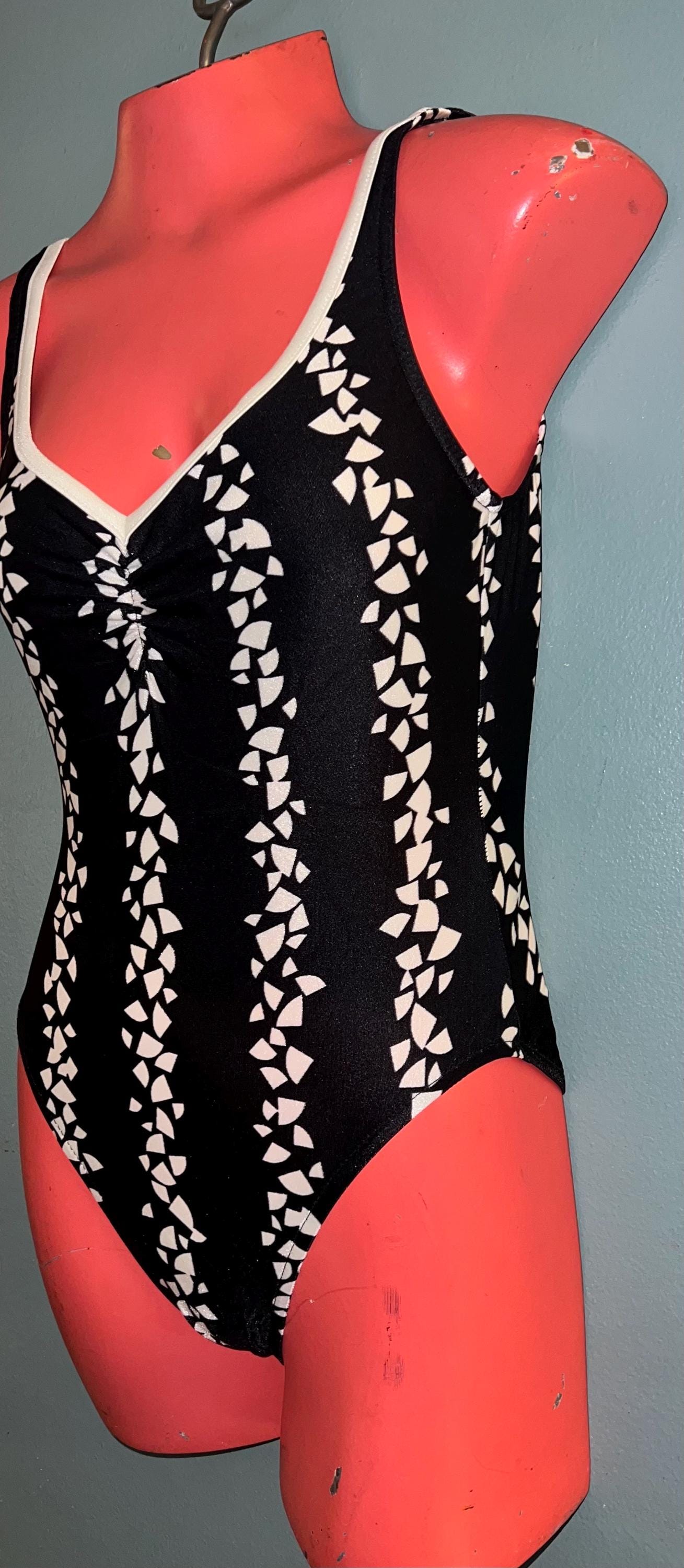 This is a really cute 1980’s black and white Swimsuit! It’s a size 10 but I will post measurements. It’s in really good vintage condition.