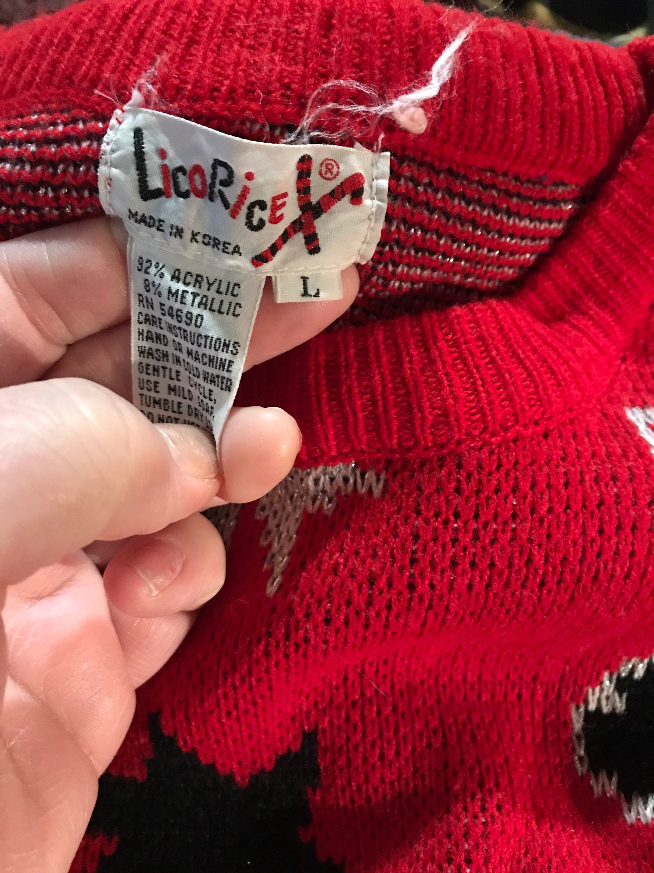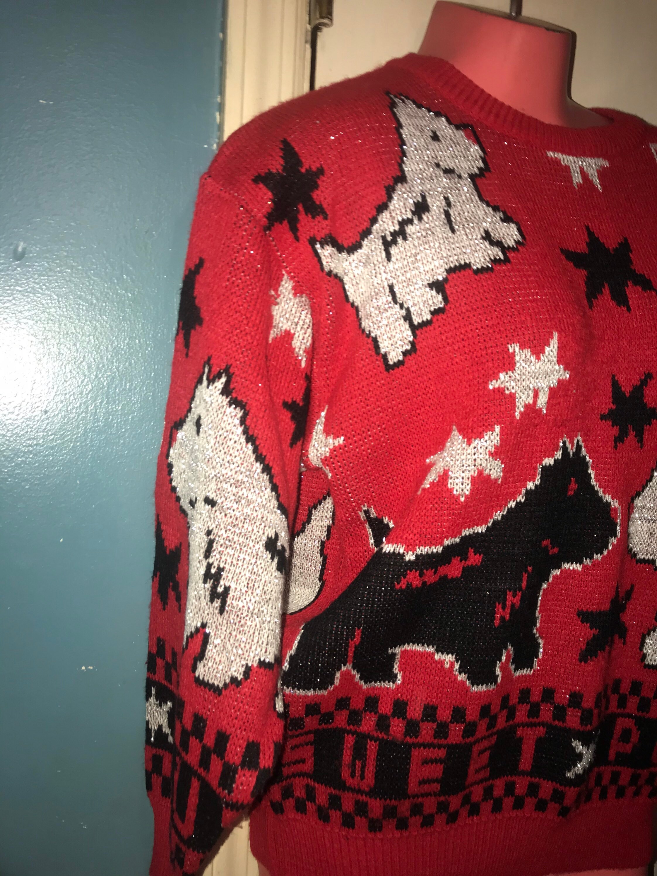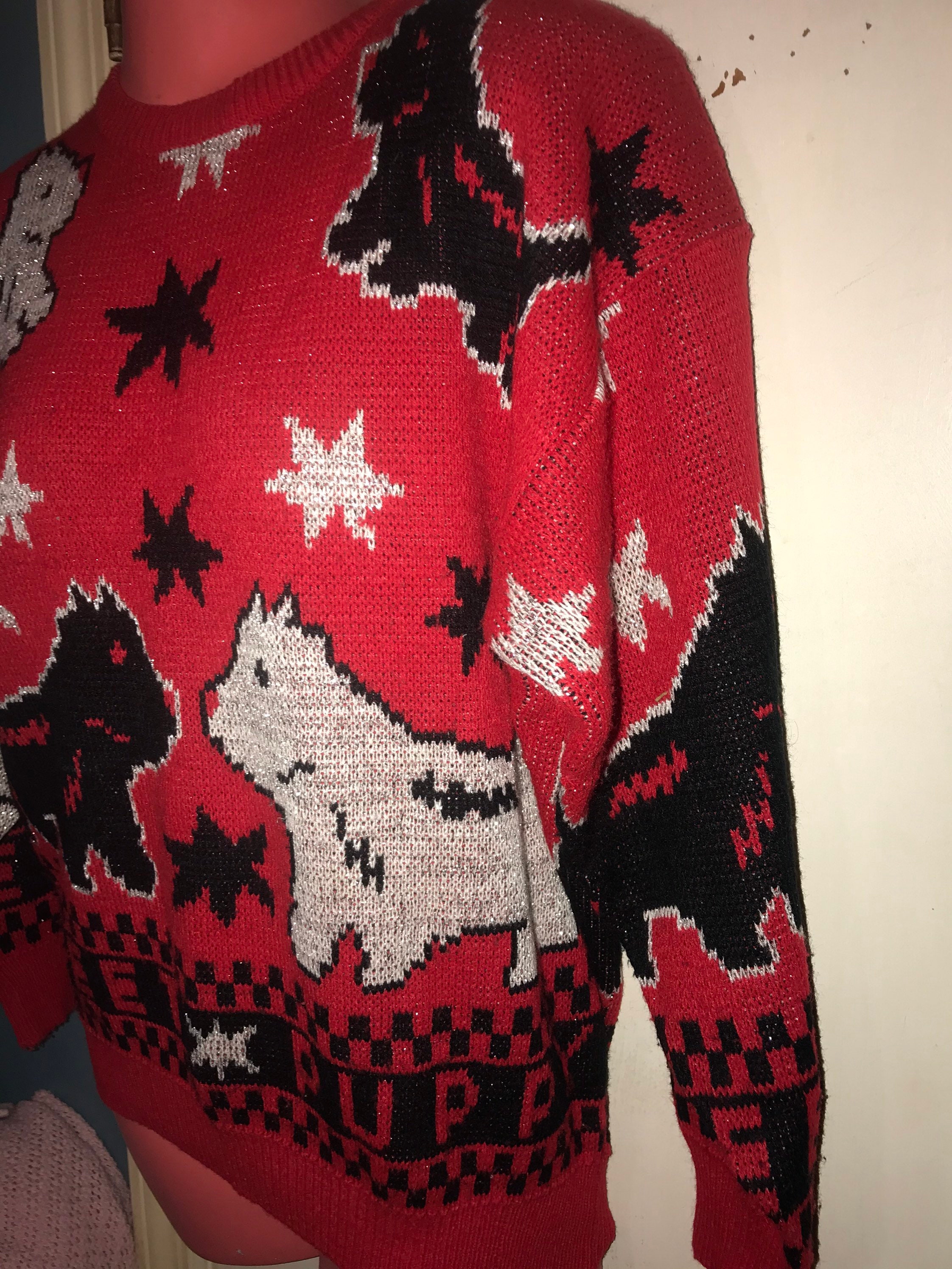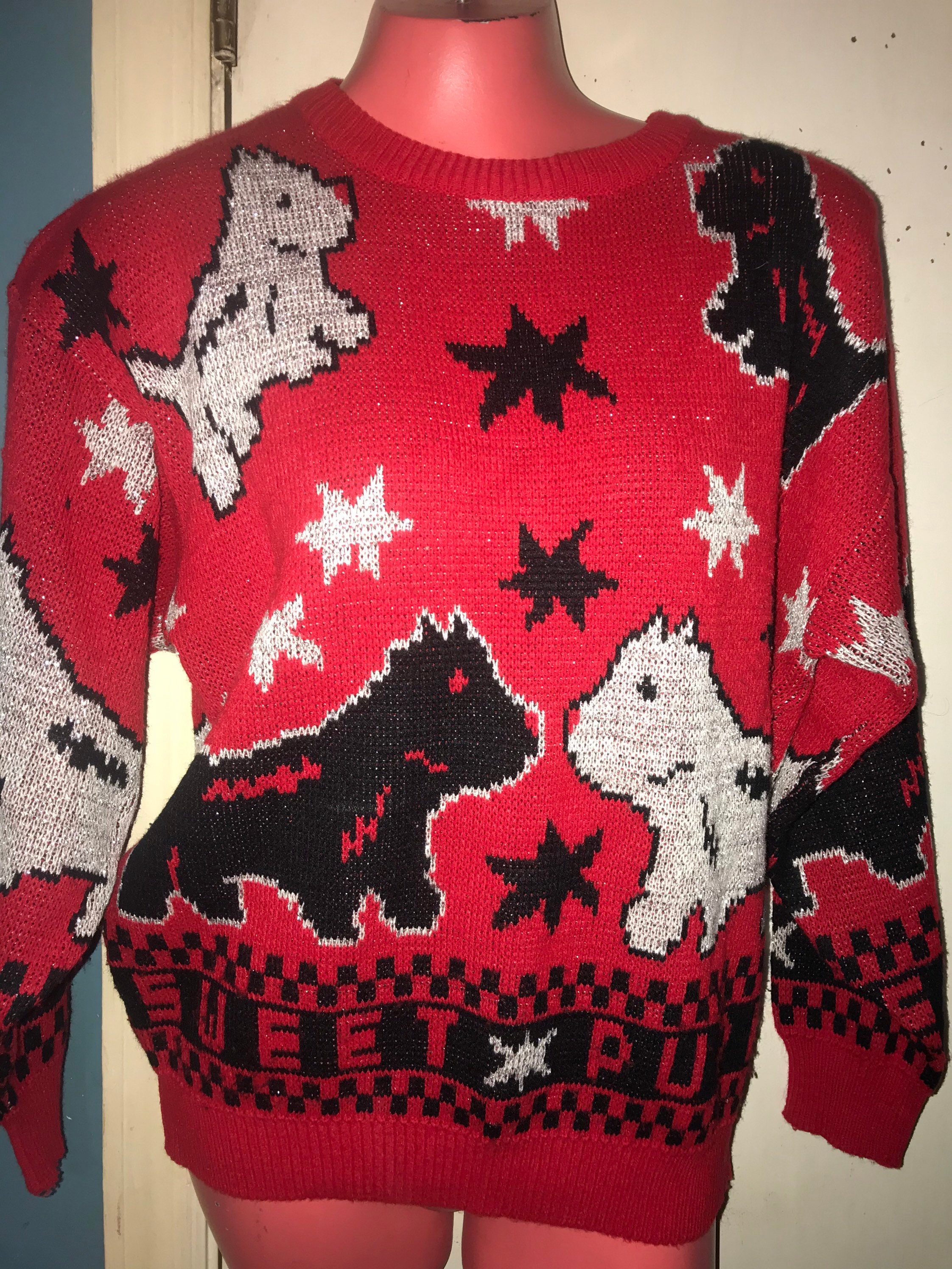 This sweater is adorable! It's red with awesome little Scottie dogs all over it with stars and it says “Star Puppy” across the bottom. It kinda has a pixel like design to it which is really cool! It's in good vintage condition.