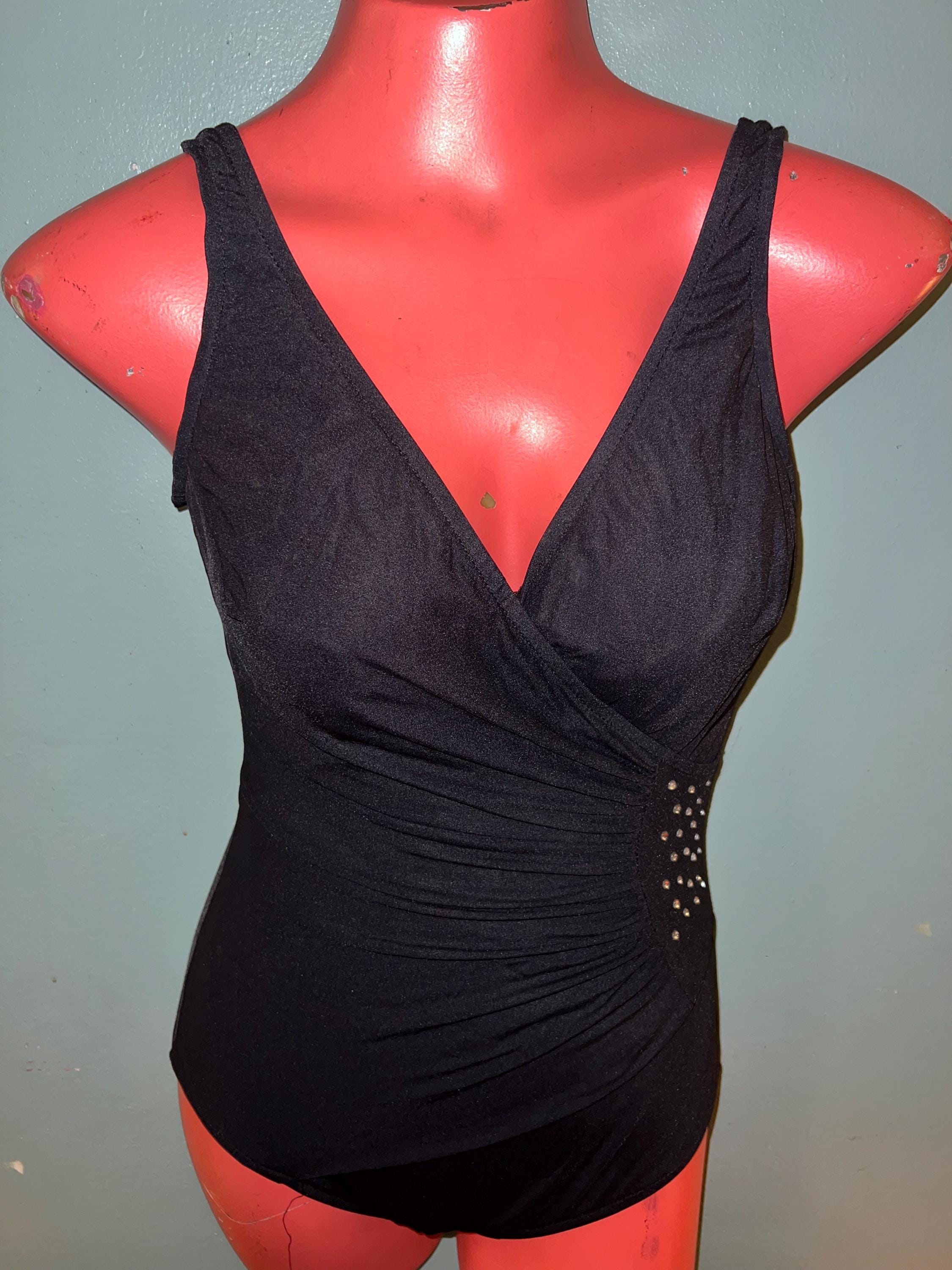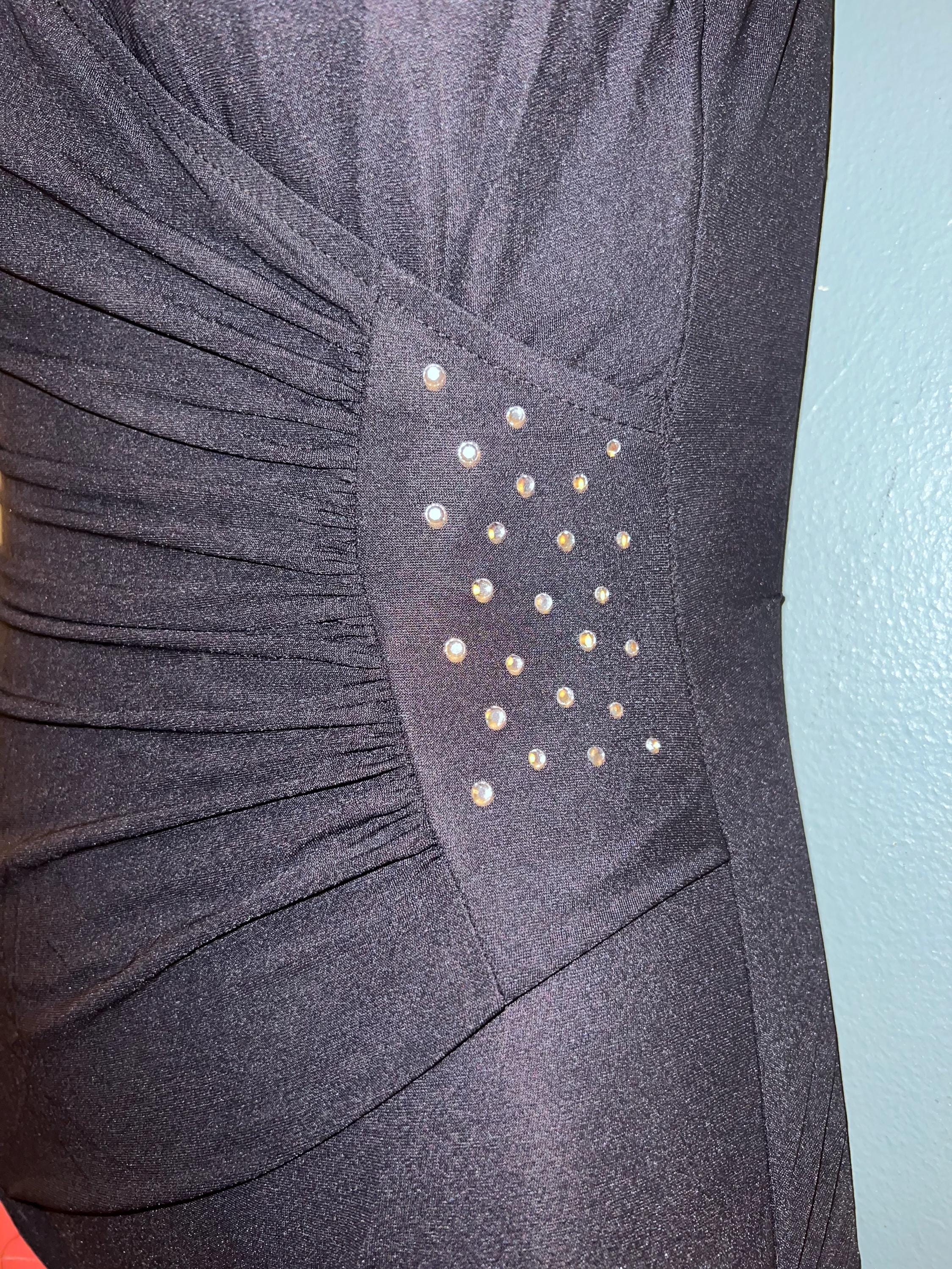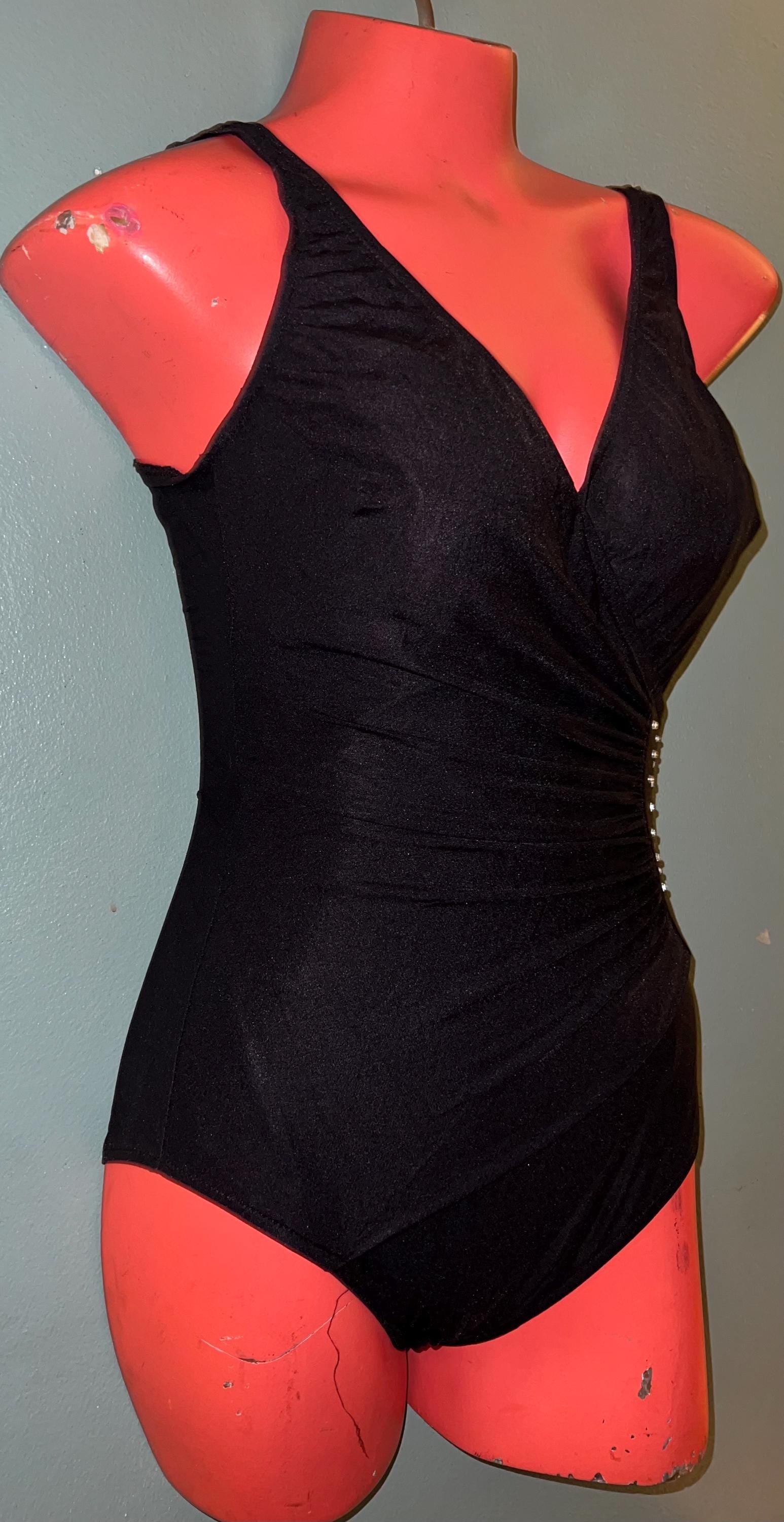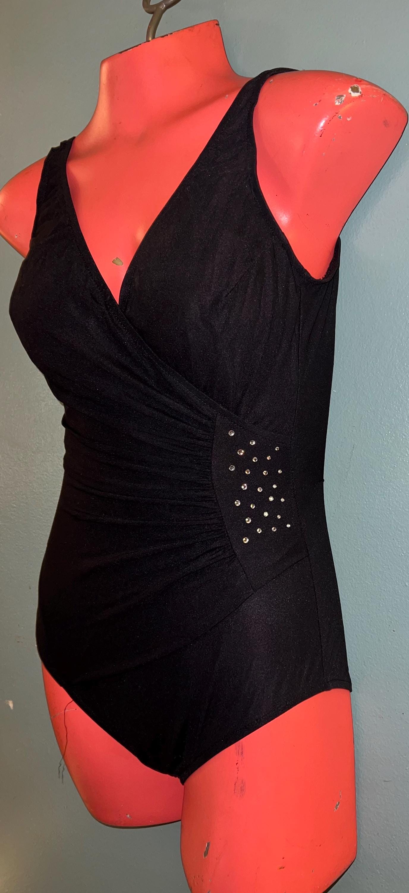 This is an adorable black with rhinestones 90’s Longitude Swimsuit! It’s in good vintage condition.
