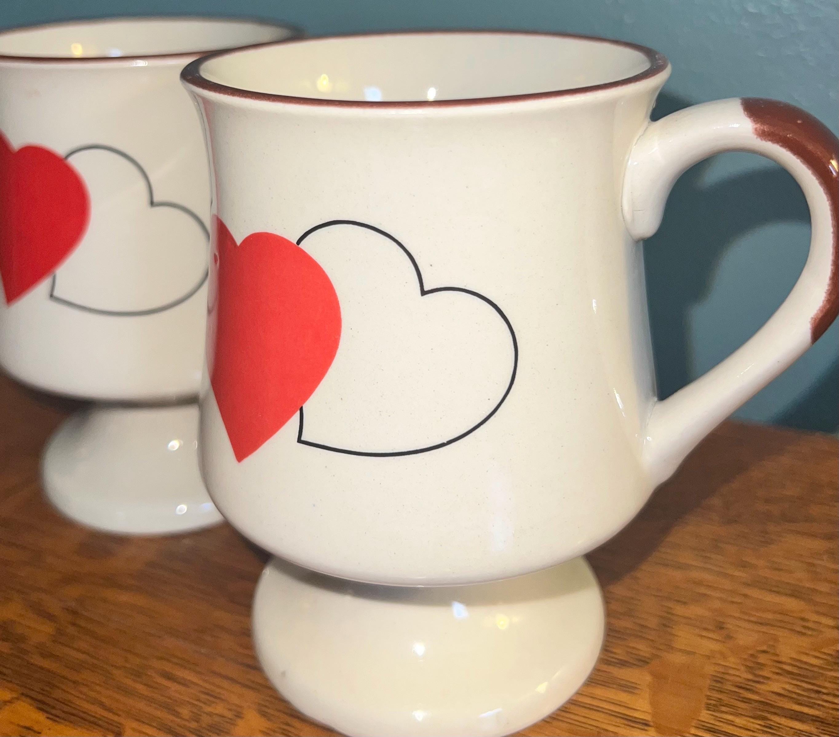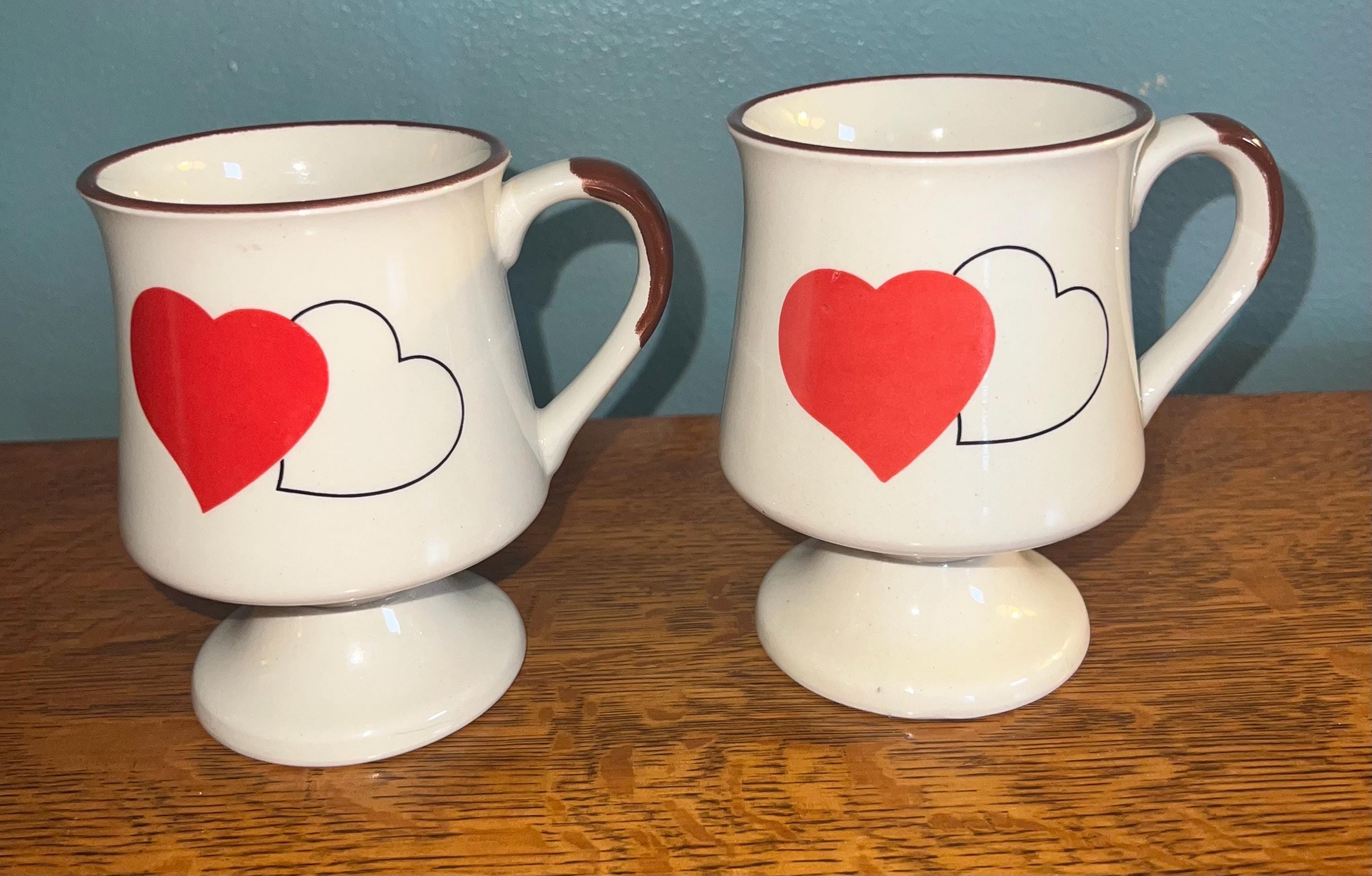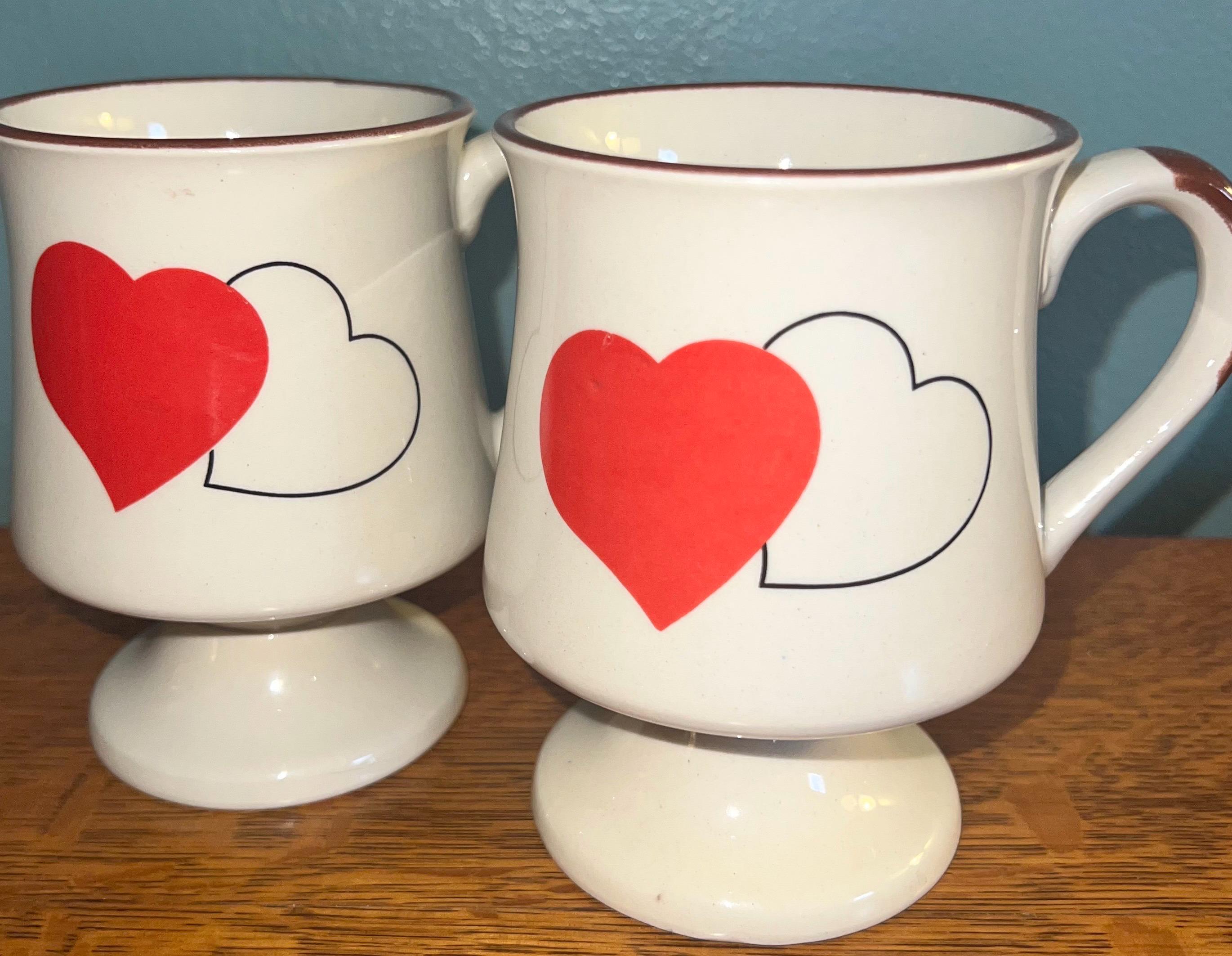 This is a great set of tall pottery mugs with hearts on them. They are unbranded. Both are in good vintage condition, one has a couple little dimples on it.